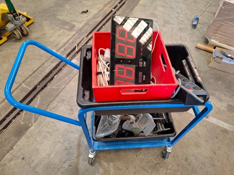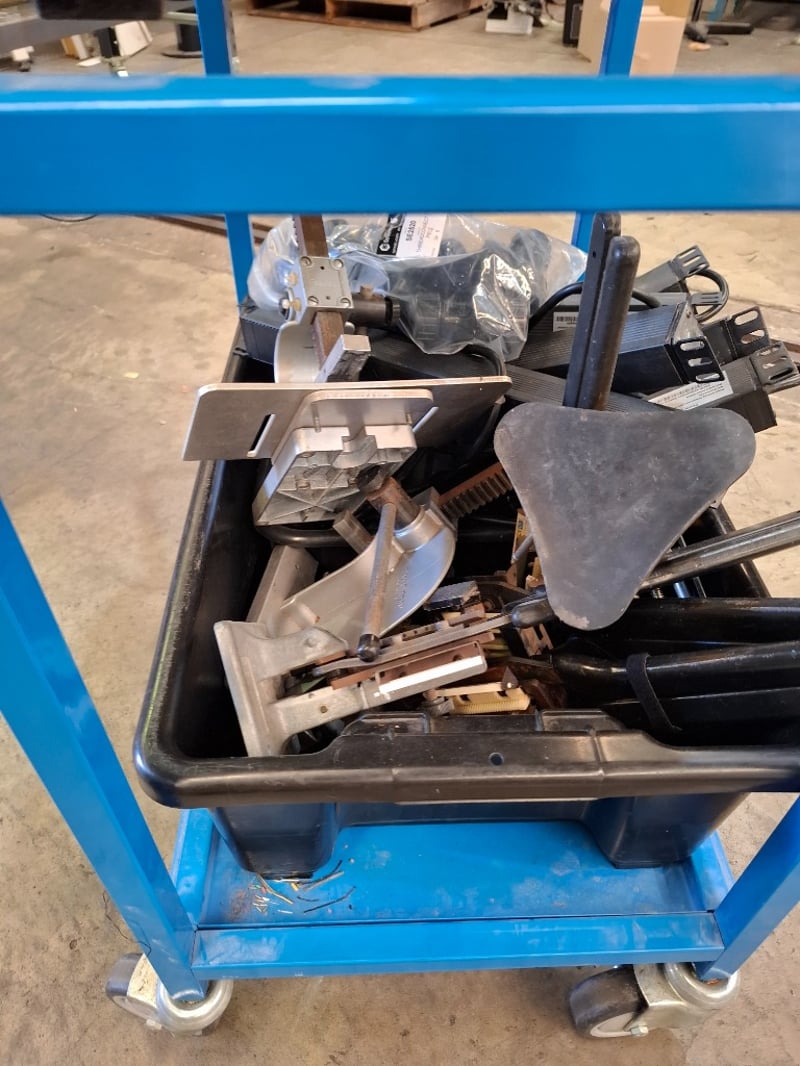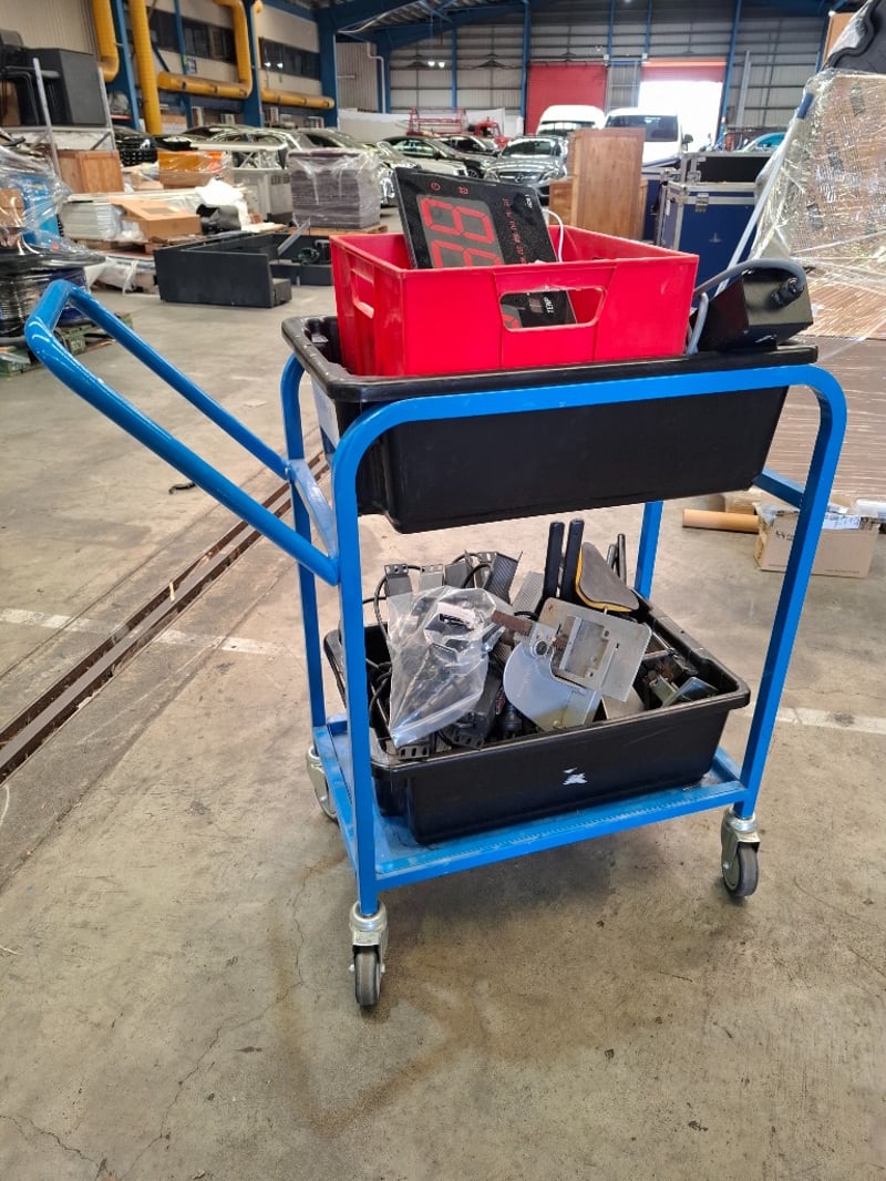 Assorted power cord boards, panapress and parts, and more includes the Trolley Dimensions: 900mmn(W) x 420mm (D) x 105mm(H) SOLD AS LOT NOTE: INSPECTIONS HIGHLY RECOMMENDED