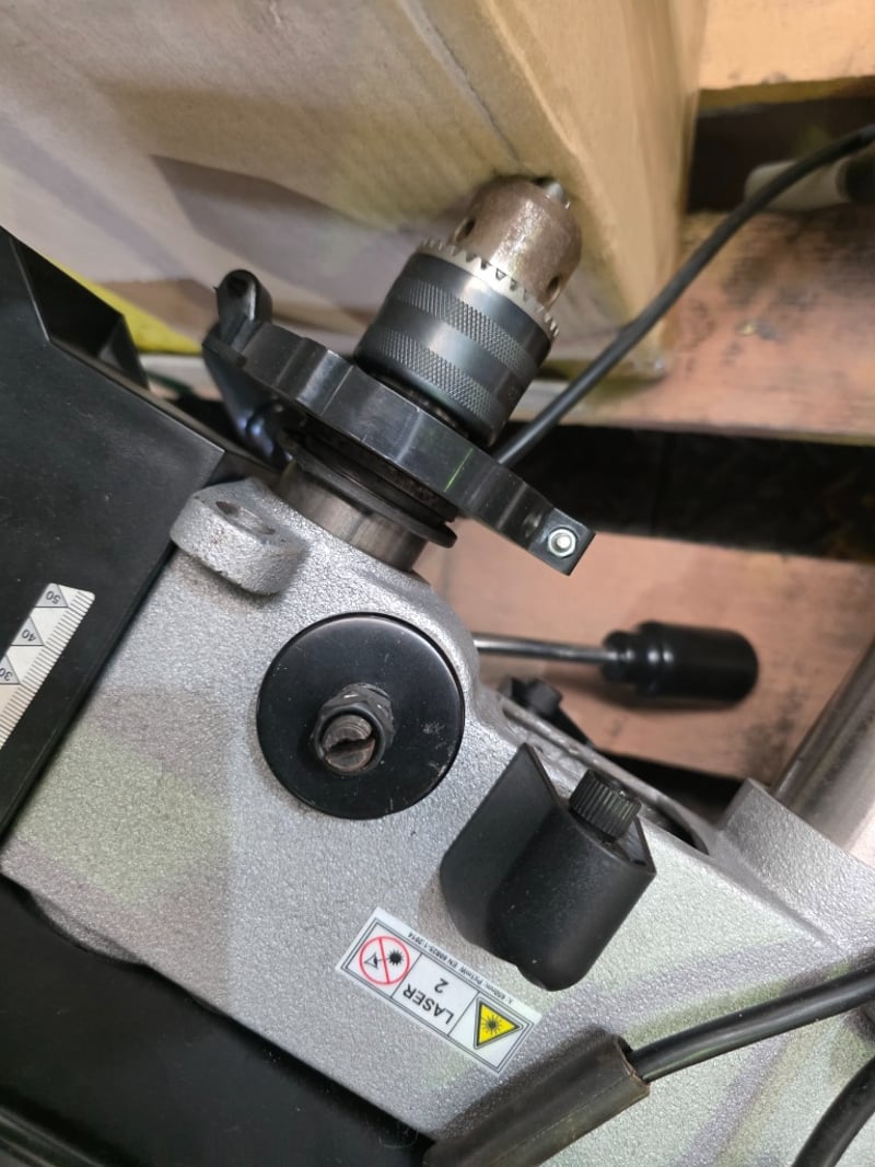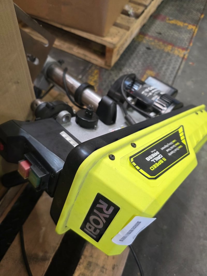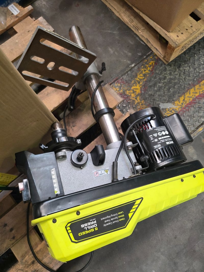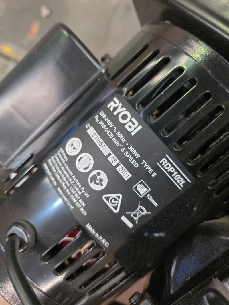 Ryobi RDP102L drill pressBrand: RyobiModel: RDP102LSerial no: 031657Year of Manufacture: 2021Description/Extras: Motor: 390W induction motor, operating on 230-240V AC. Speeds: 5 distinct speeds ranging from 510 to 2430 RPM.Chuck: A 13mm (1/2 inch) keyed chuck. Capacity: 50mm spindle travel and a throat depth of 127mm.NOTE: INSPECTIONS HIGHLY RECOMMENDED
