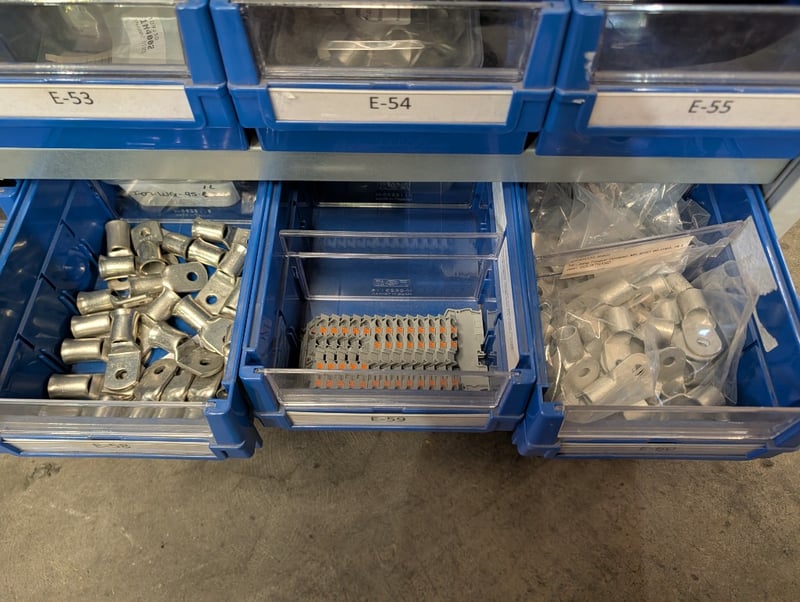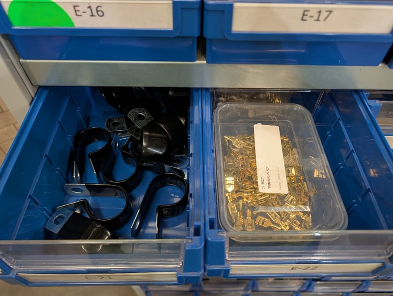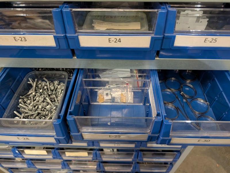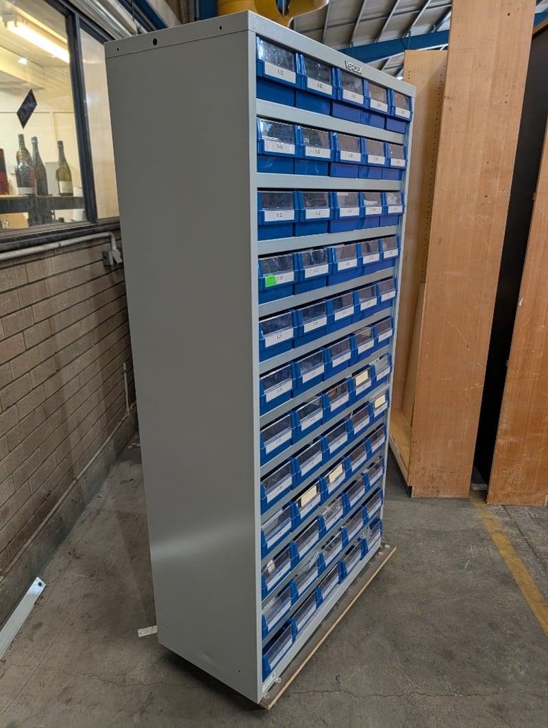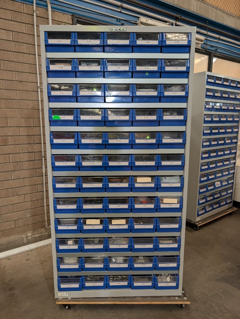 Verdex industrial parts storage cabinet system on wheels, featuring 14 horizontal shelves with 70 blue plastic bins (5 bins per shelf). Each bin is individually labeled (E-1 through E-70) and contains various fasteners, hardware, and mechanical components including bolts, nuts, washers and more.