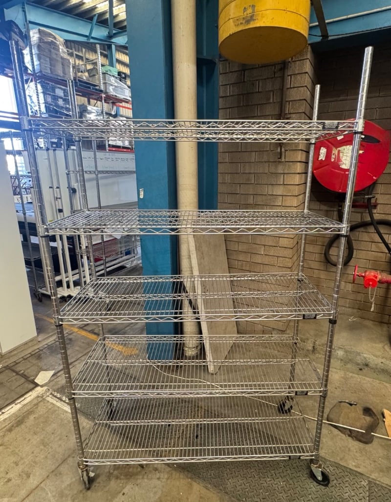 Heavy-duty chrome wire shelving unit featuring six adjustable shelves with wire mesh construction. Dimensions: 122cm x 46cm x 195