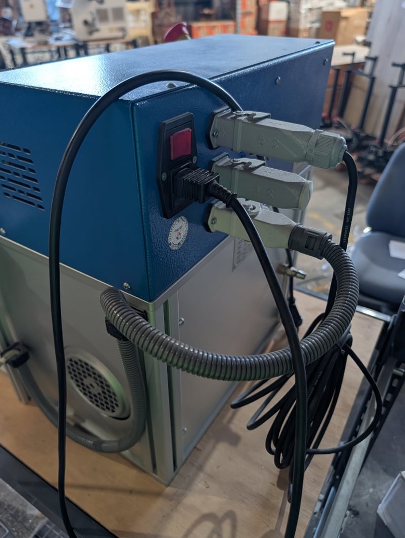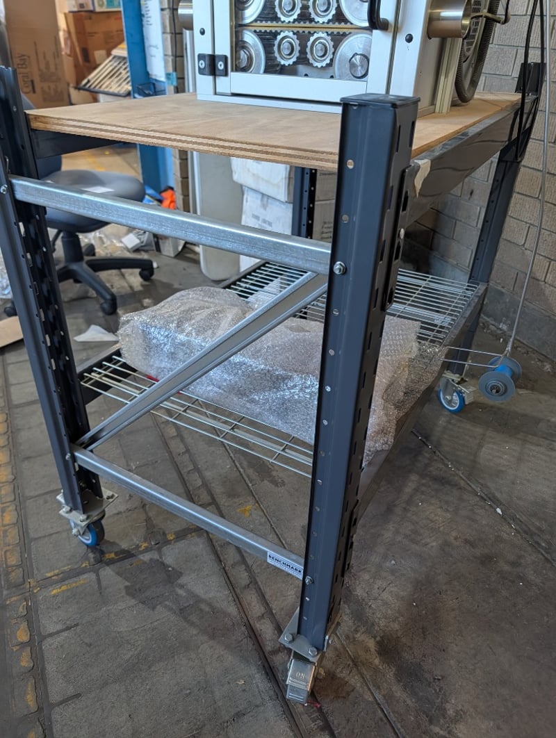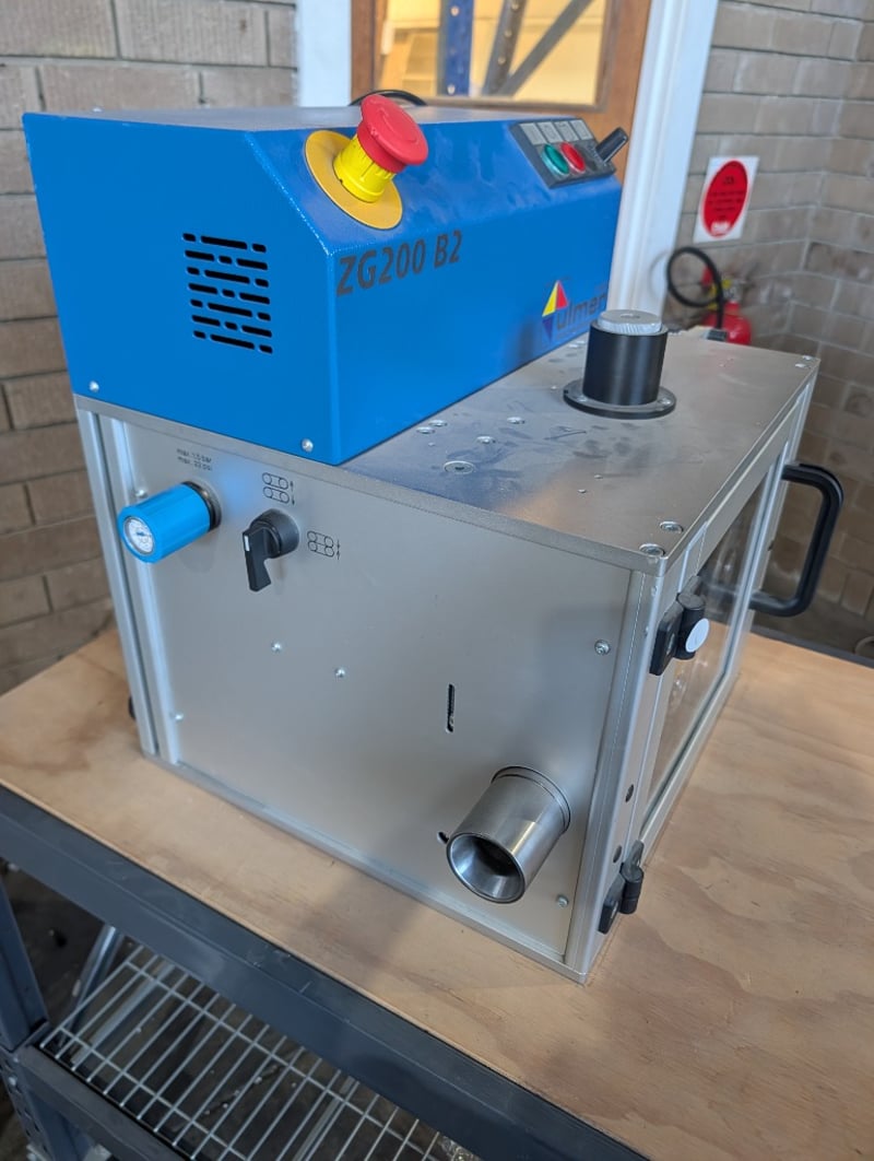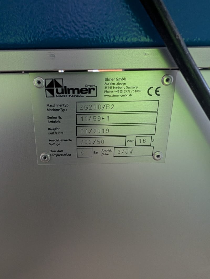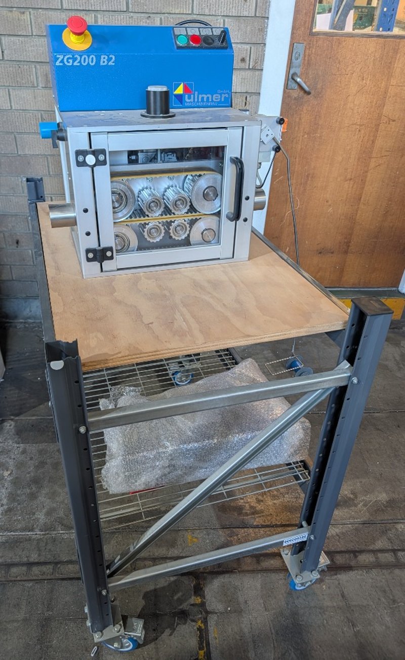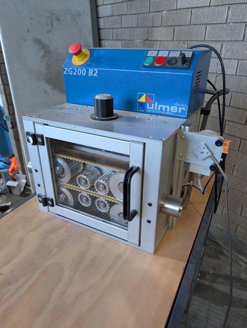 ZG200 B2 feeder, designed to feed materials such as cables, hoses, tapes, flat cable. The Machine is on a wooden workbench with metal frame support structure