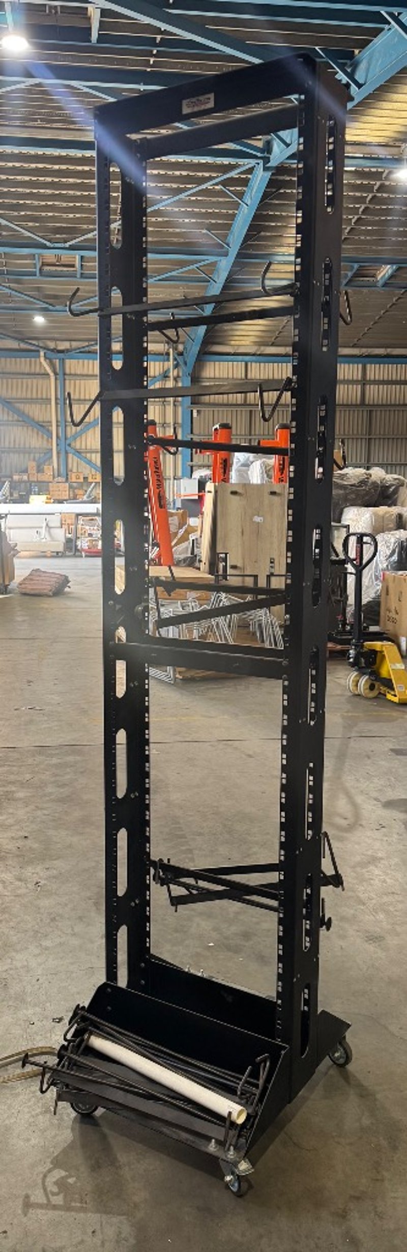 Heavy-duty industrial vertical server rack or equipment cabinet featuring a robust black steel frame construction.