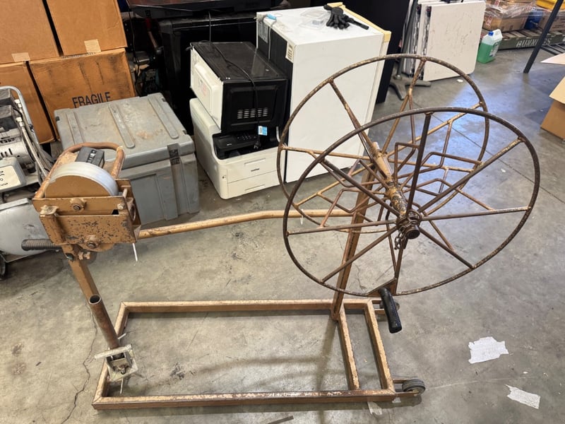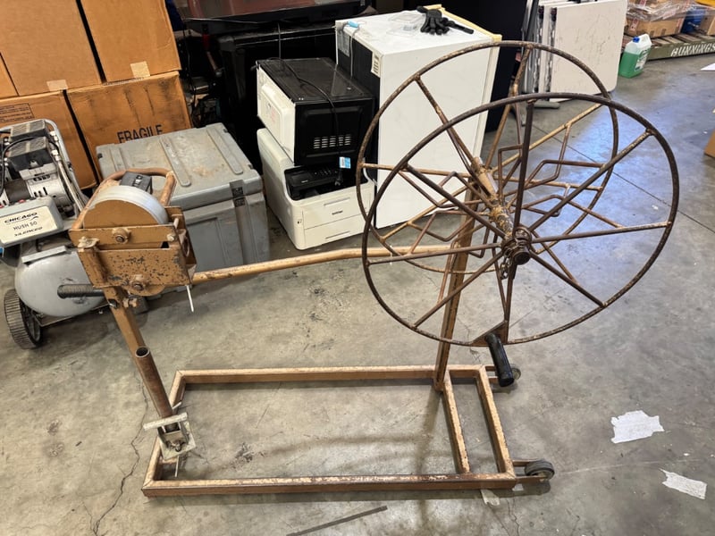 Vintage industrial garden hose reel cart featuring a robust welded steel frame with two large diameter wire wheels and a smaller castor wheel for mobility.