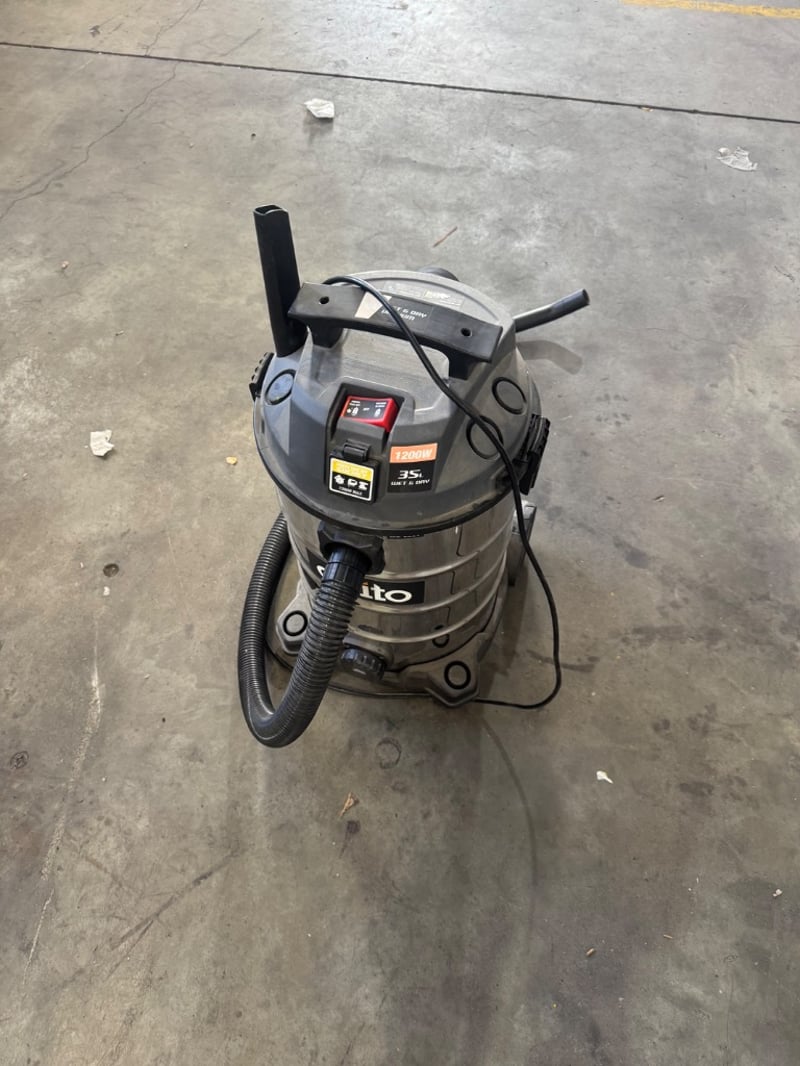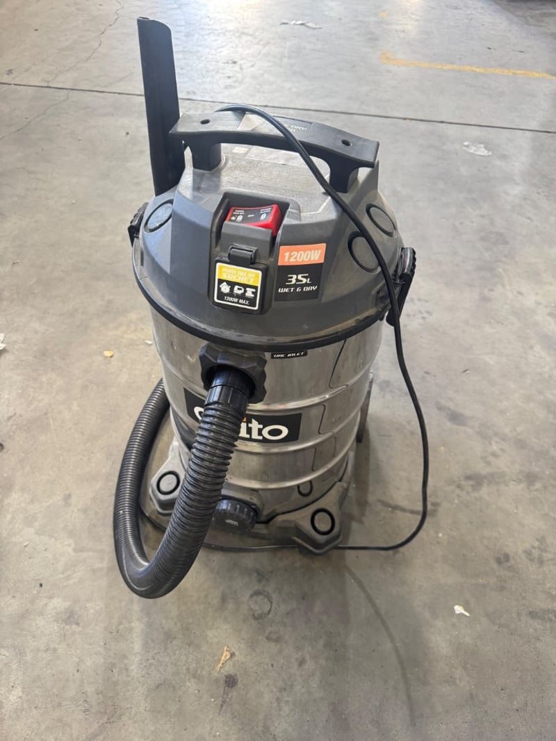 Itto wet/dry vacuum cleaner, 35L capacity, 1200W power. Stainless steel drum construction with dual handle design for maneuvering. Features electronic control panel with multiple function buttons, power indicator, and wet/dry operation capability. Includes hose attachment and floor nozzle.