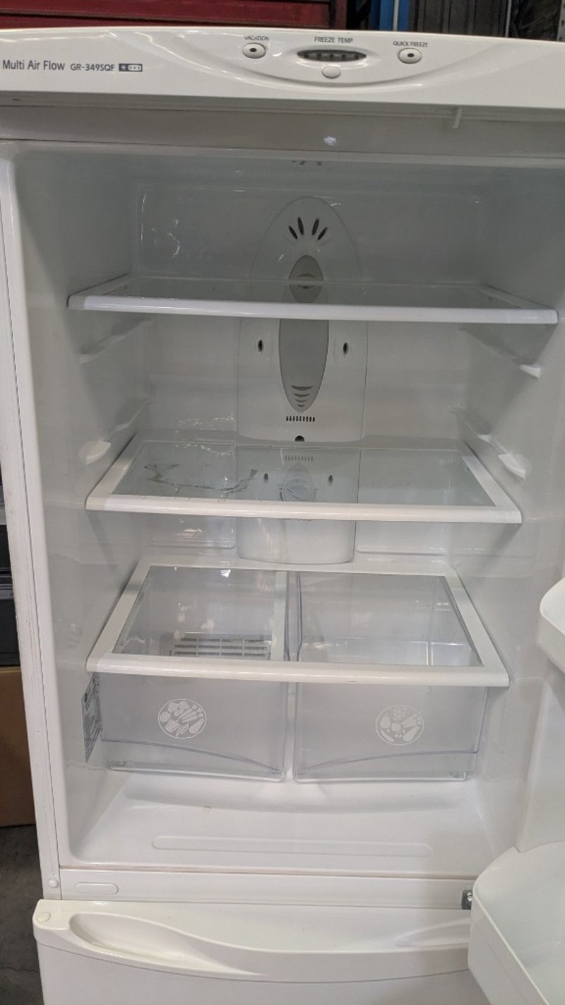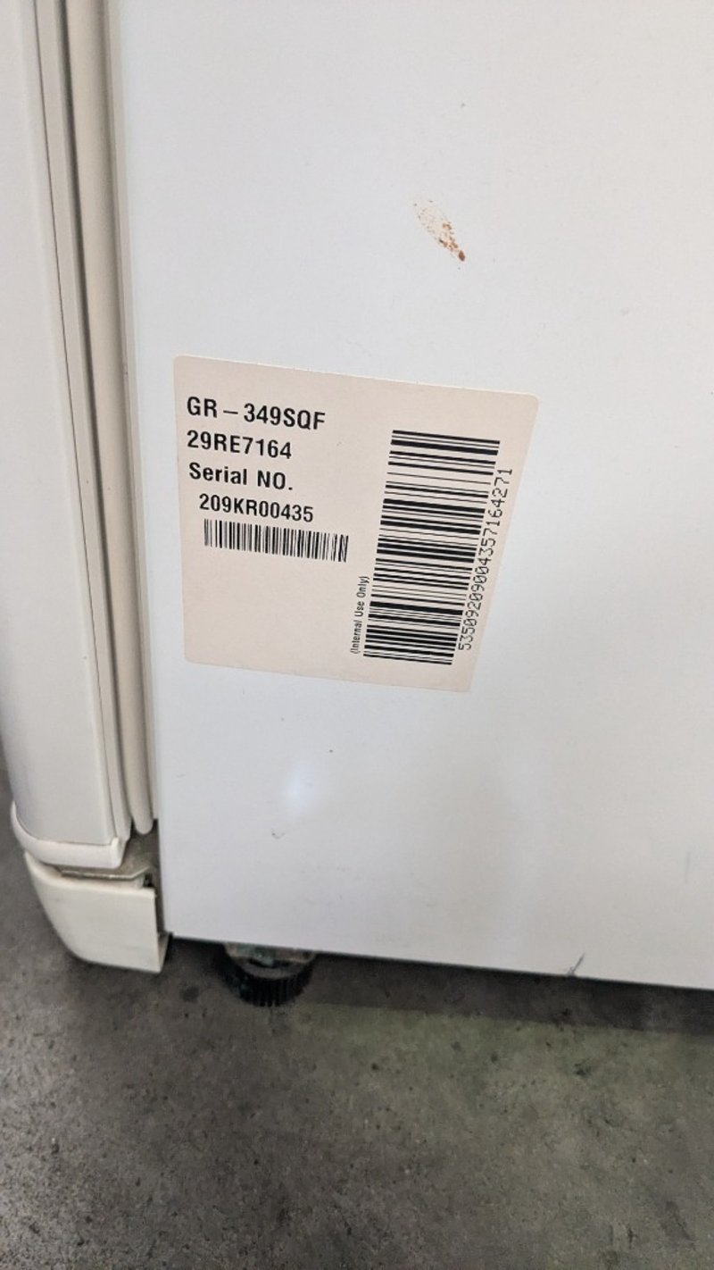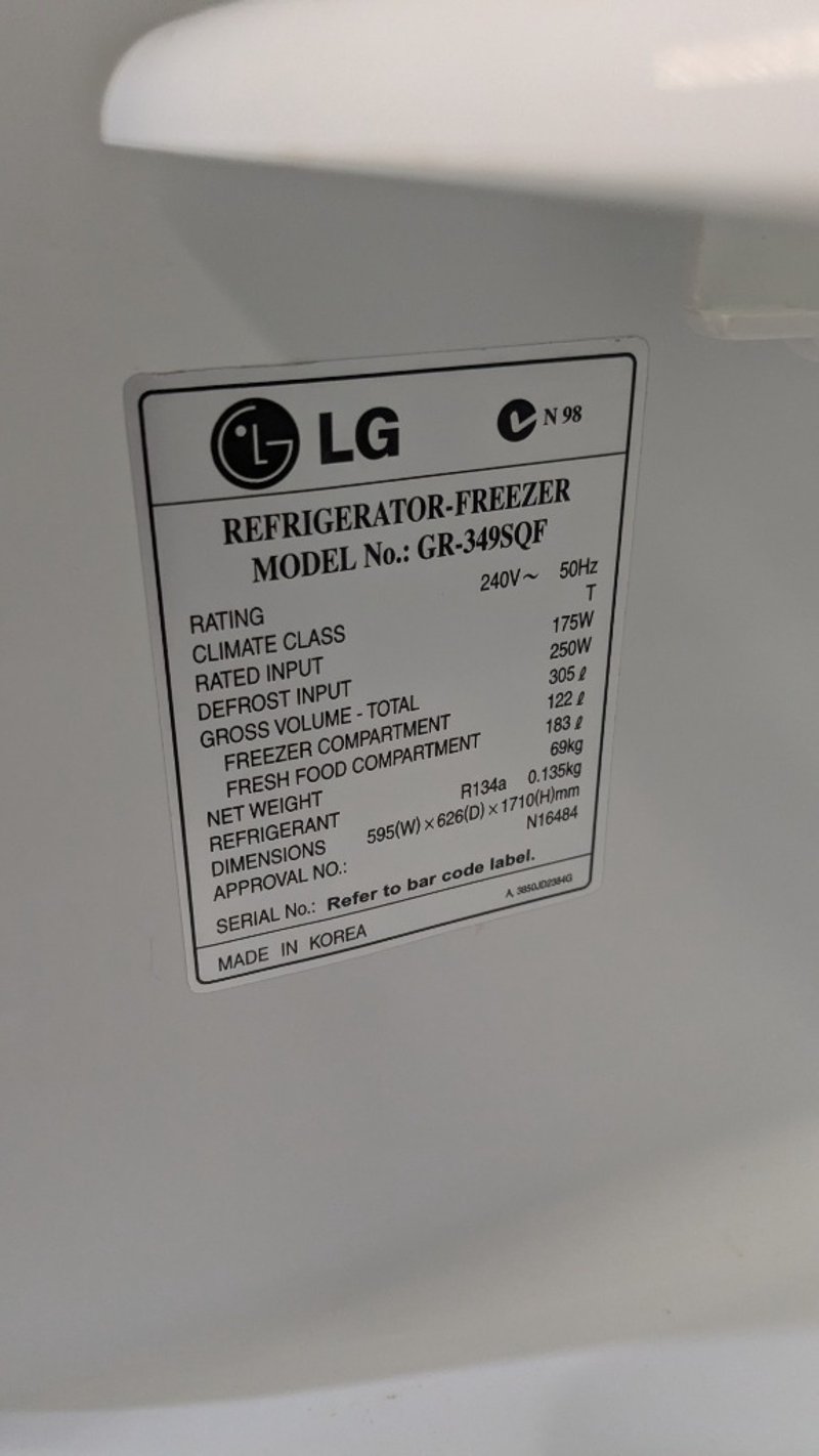 LG GR-349SQF Refrigerator/Freezer Brand: LG Model: GR-349SQF Description/Extras: Total Gross Volume: 305 Liters, Power Input: 240V~ 50Hz, with a 175W rating, Refrigerant: R134a, Door Storage, Adjustable Shelves Dimensions: 595mm (W) x 626mm (D) x 1710mm (H) NOTE: INSPECTIONS HIGHLY RECOMMENDED