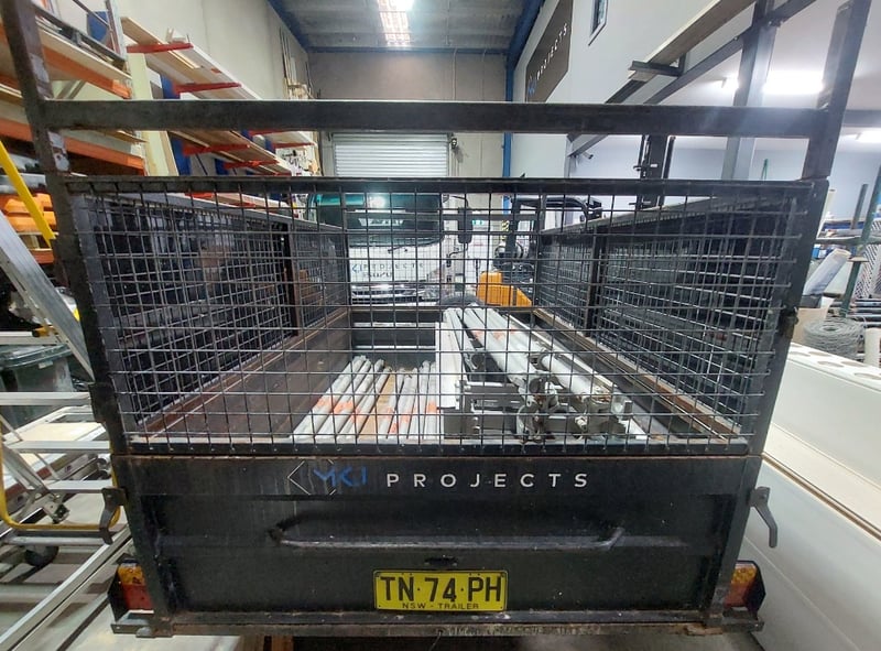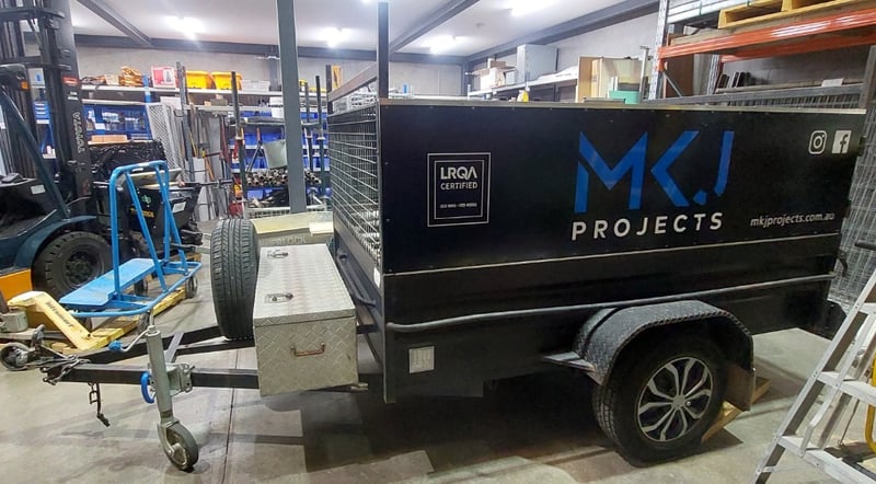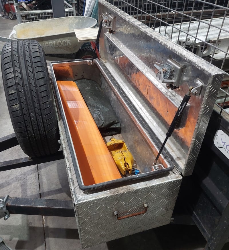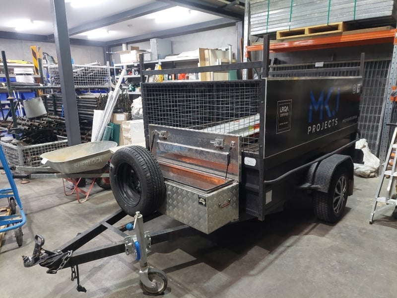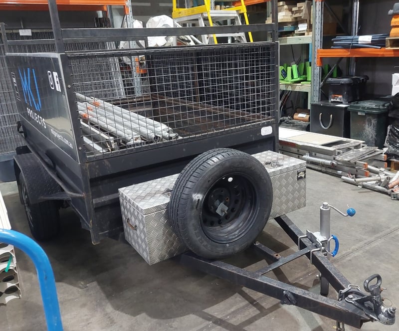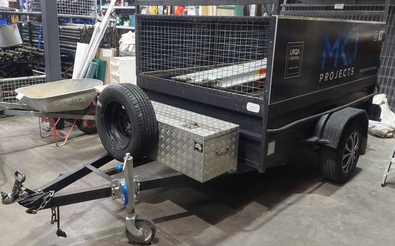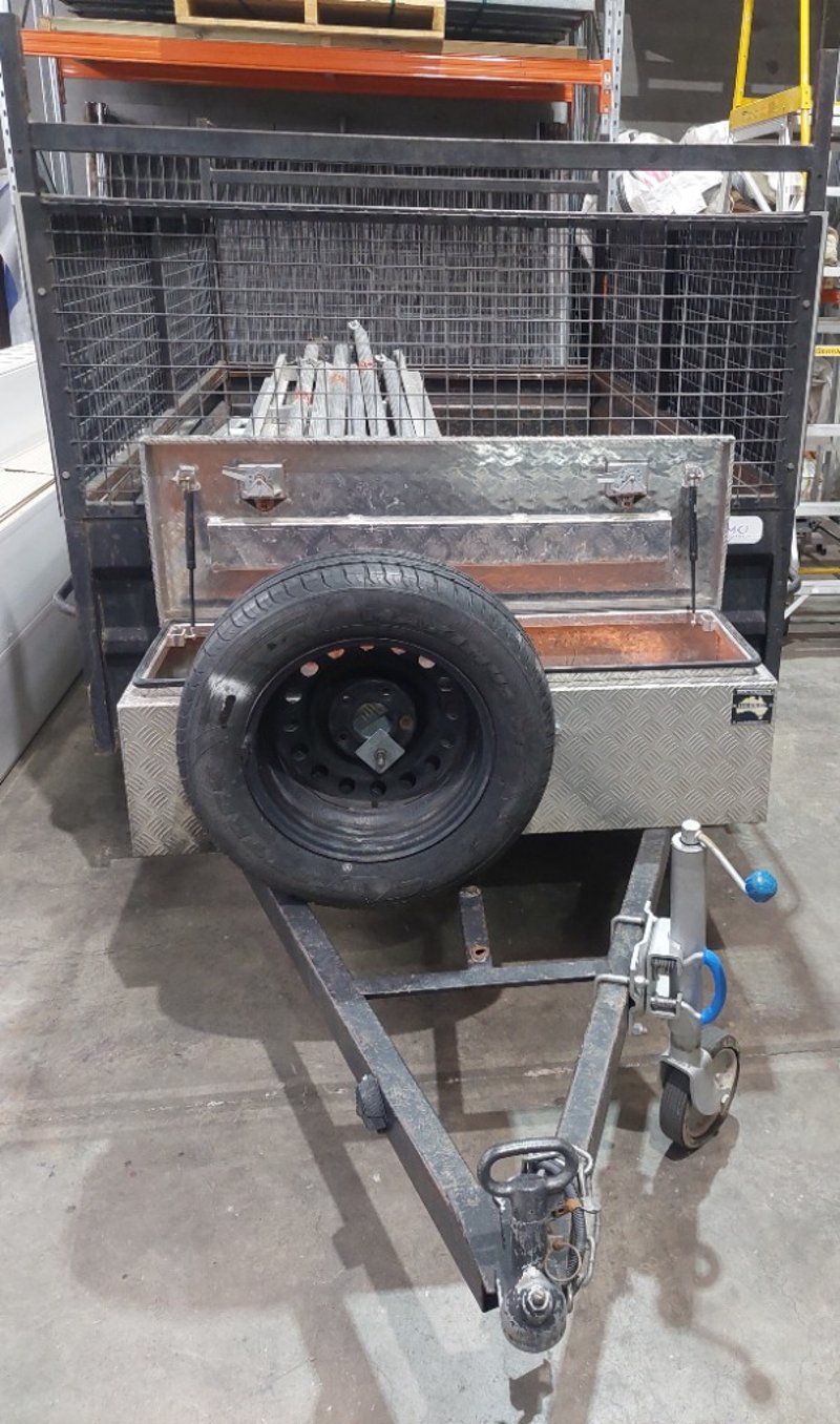 2019 Box Trailer - Mechid Trailers, 8'x5', single axle, black steel, checkerplate floor and wheel arches, 15" steel rims with spare, Al-Ko 2,000kg 50mm dia. ball hitch, Ark jockey wheel, removable mesh cage, removable ladder racks, Toolsinabox checkerplate tool chest mounted on draw bar, ATM: 750kg, NSW Reg. TN-74-PH, Expiry: 20/03/27, VIN: 6M0B0XTRLKS000781
