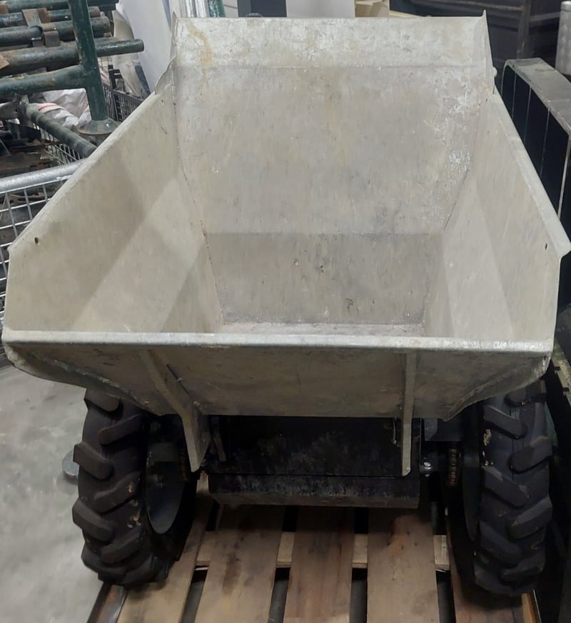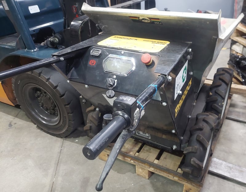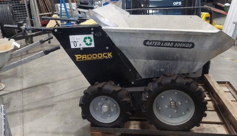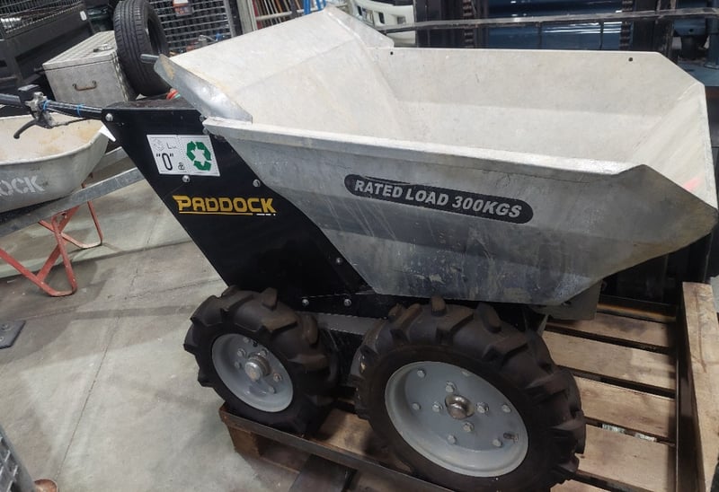 Electric Wheel Barrow - Paddock Machinery SPBE300, 500W, 300kg, galvanised steel tipping bucket, LCD readout, hour meter: 235hr, S/N: 021221874