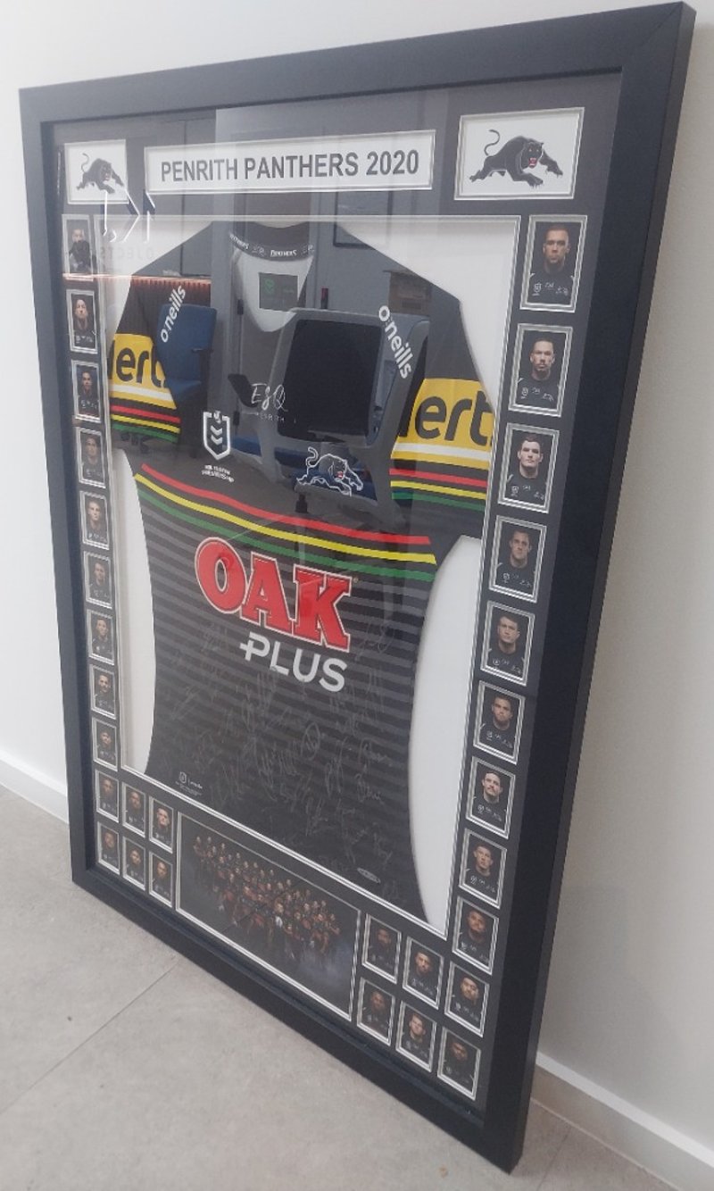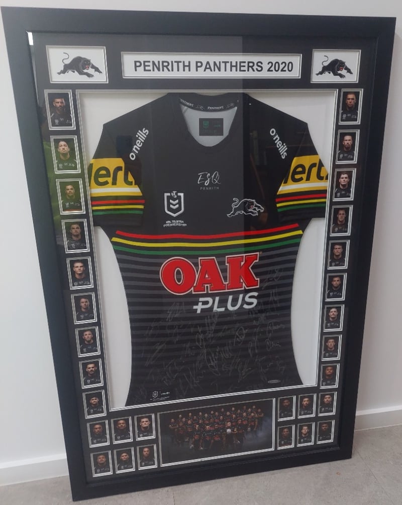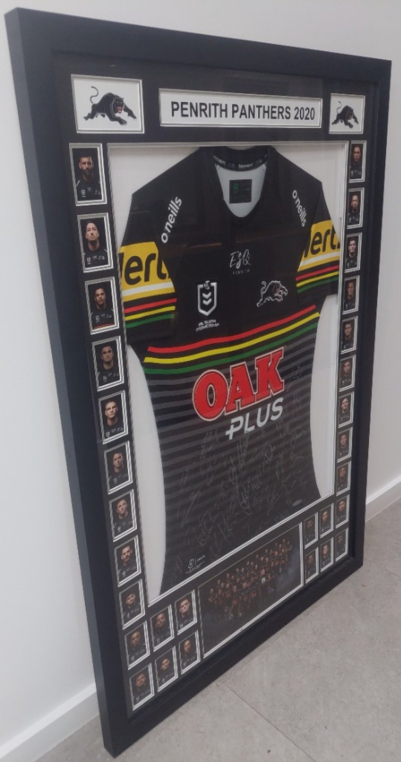 Framed, team-signed Penrith Panthers 2020 NRL jerseyDims: 125cm H, 85cm W, 3cm D.