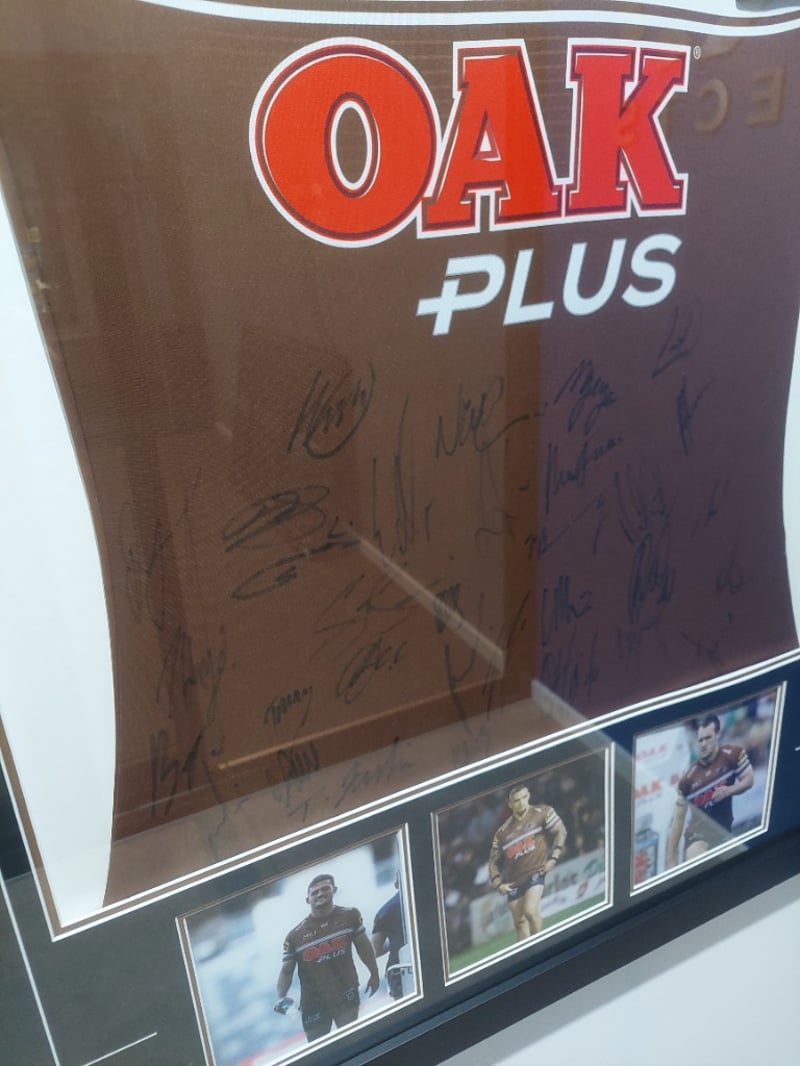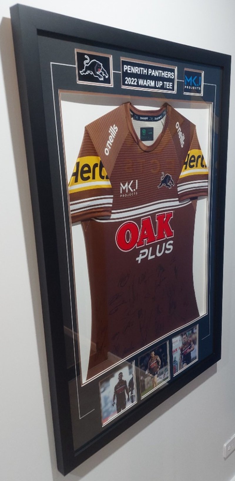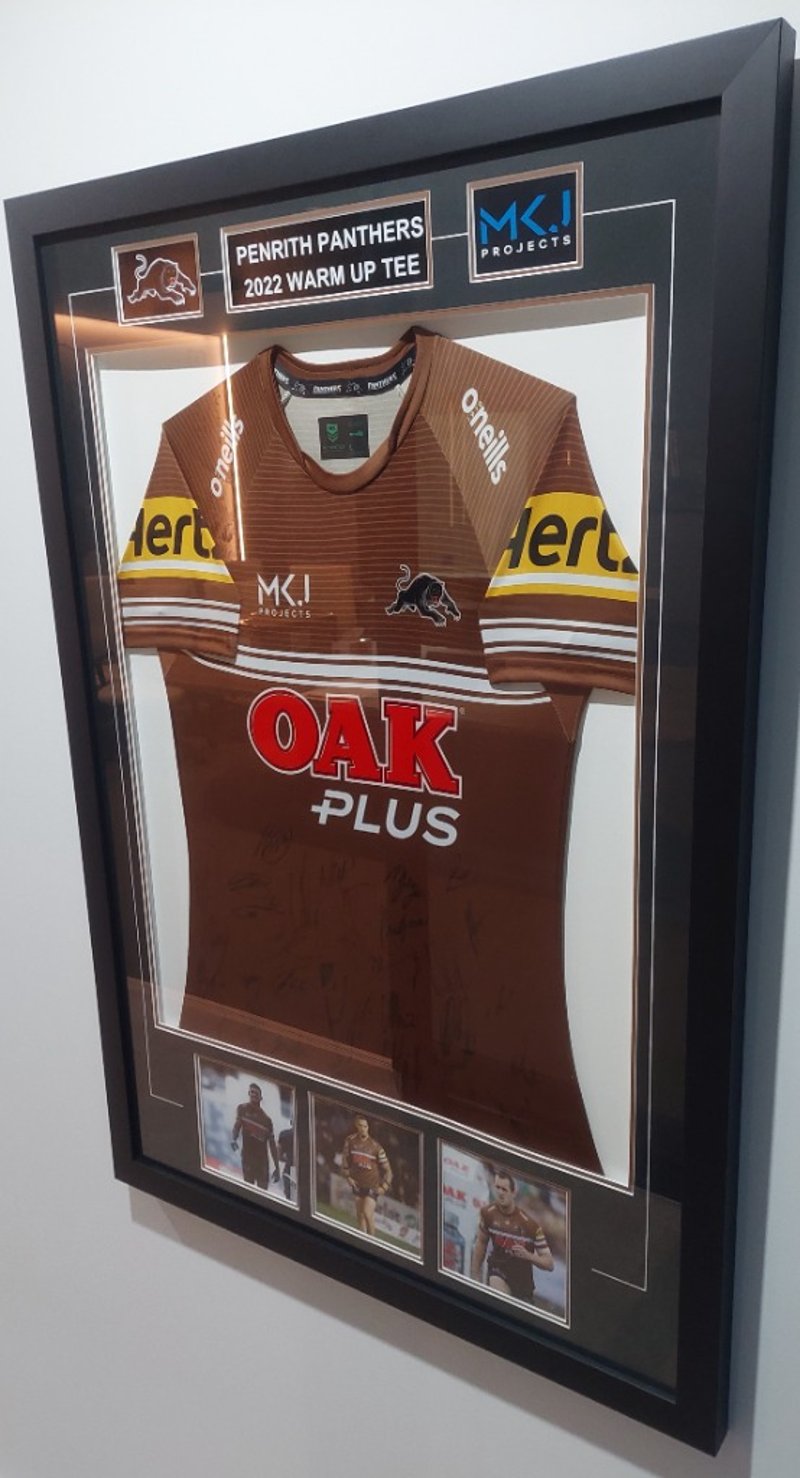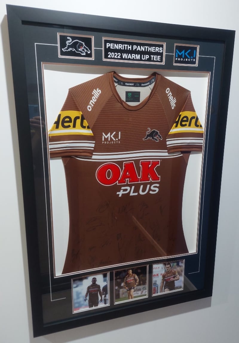 Framed, autographed Penrith Panthers 2022 warm-up t-shirt.Dims:120cm H, 84cm W, 3cm D