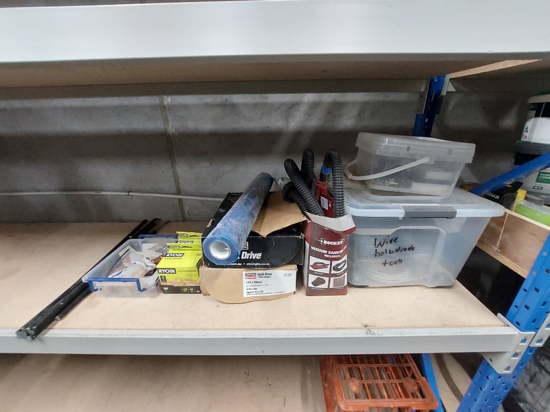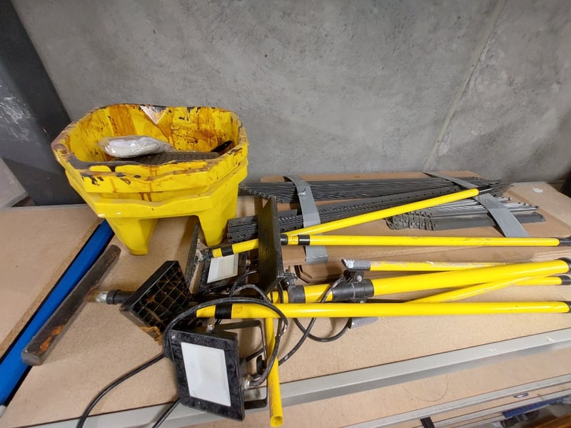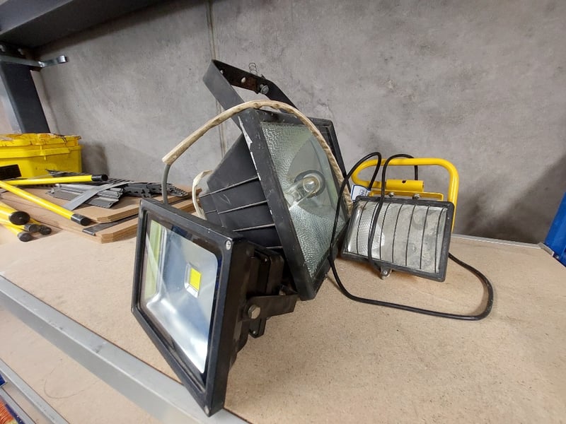 Assorted lot includes halogen work light, portable LED floodlights, vacuum sanding kit and more...Sold as lot. Notes: items untested and signs of wear. Racking not included.