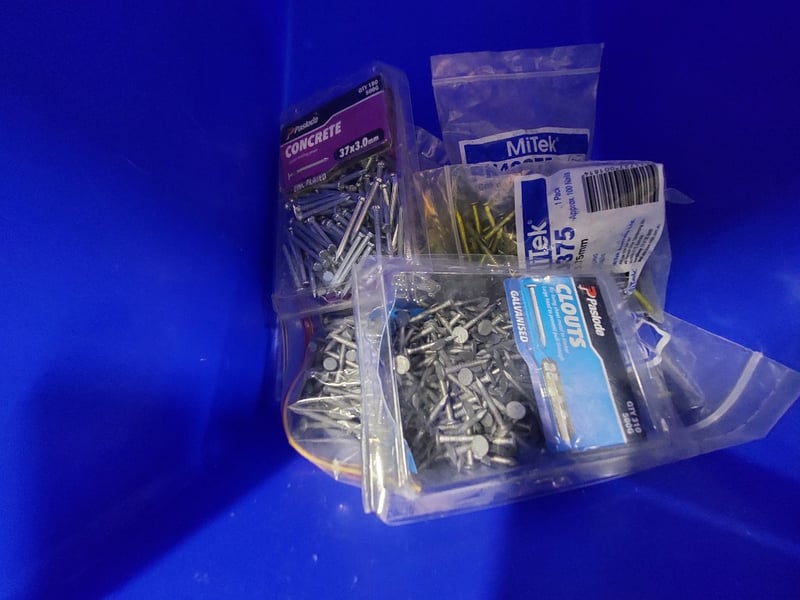 Assorted lot includes, Coil nails,Various sizes of screws , bolts and more...