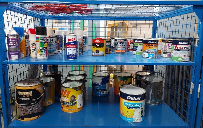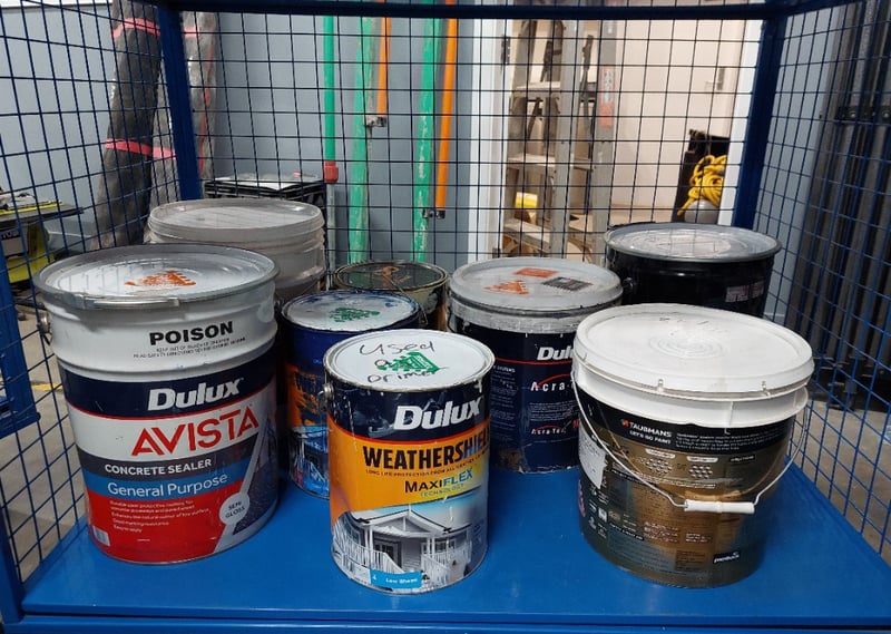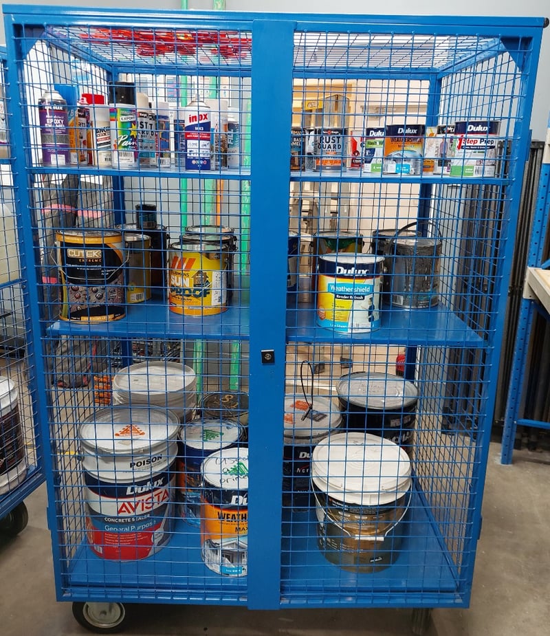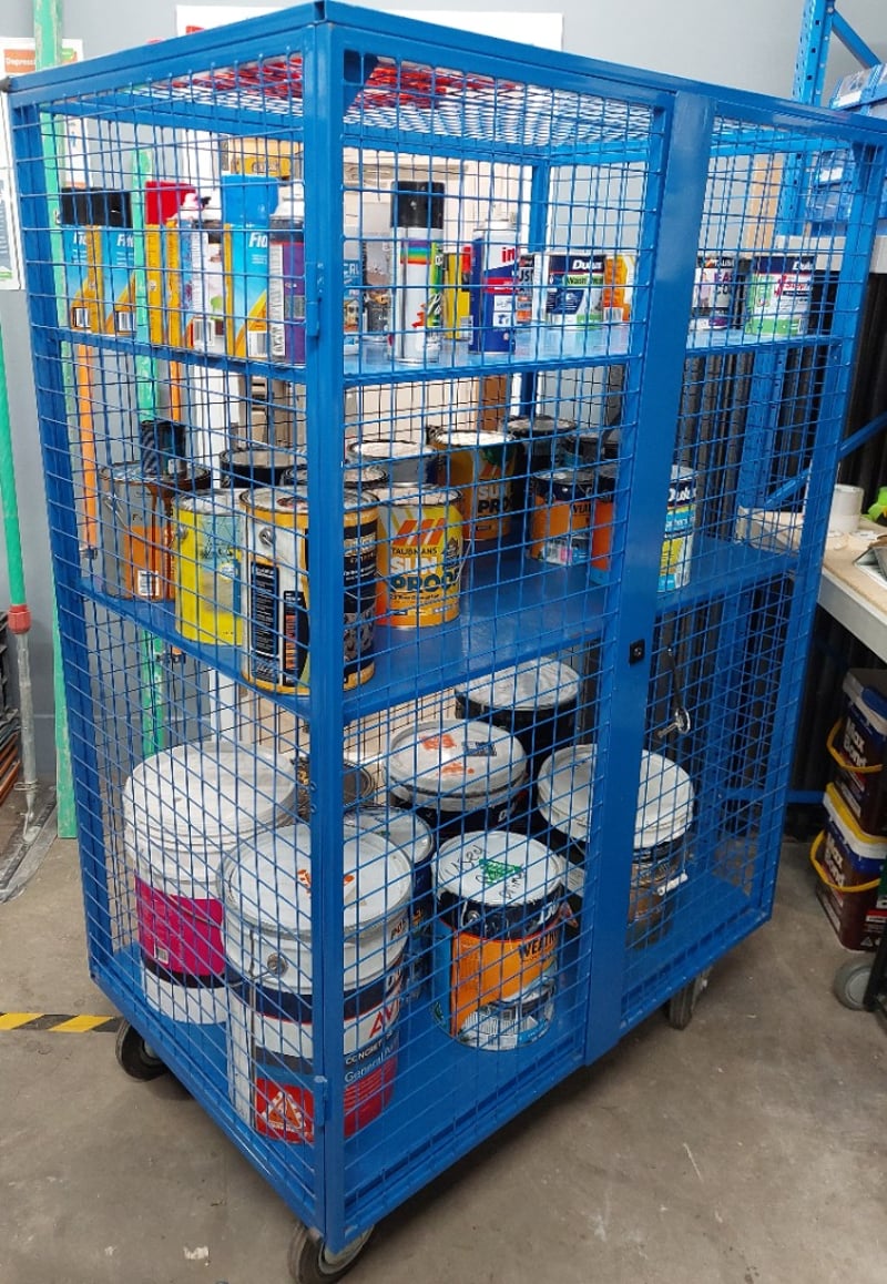 QLockable blue mesh cage trolley includes content such as assorted primers, enamels, concreate sealers and more...Dimensions: 118cm L, 75cm W, 175cm HSold as a lot.