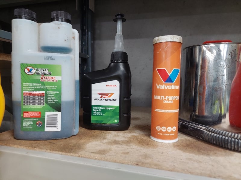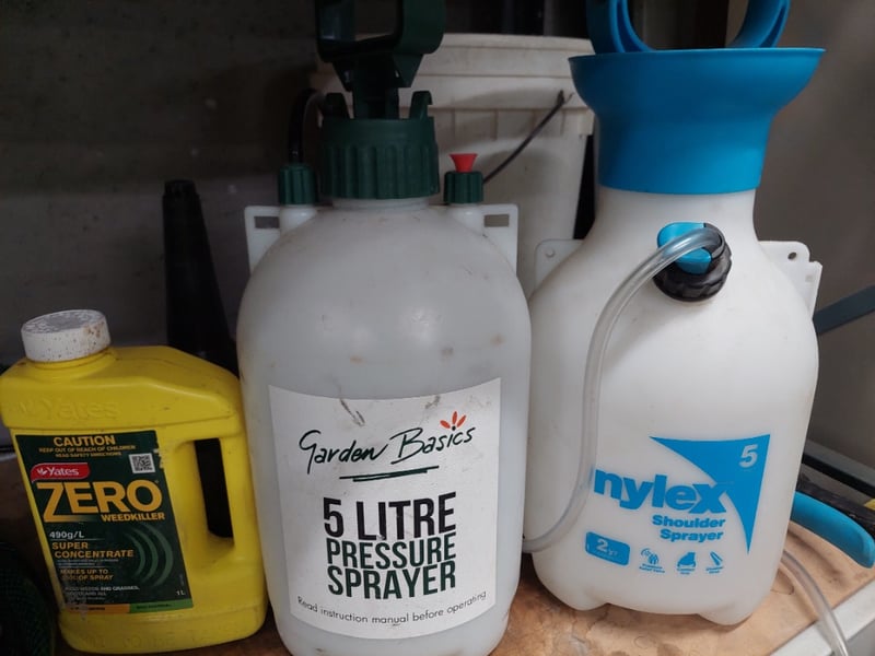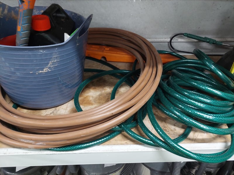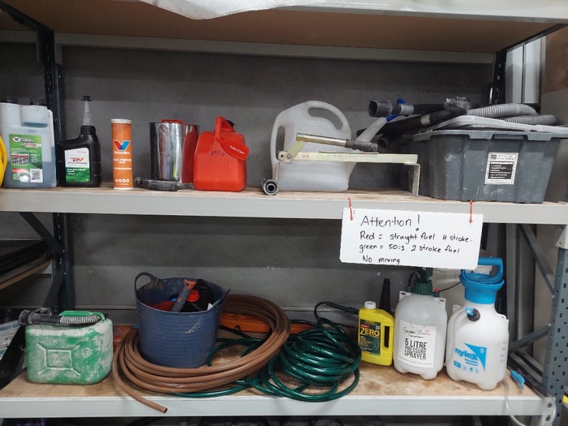 Assorted lot includes, petrol cans, pressure sprayer, hoses, and more...Sold as lot. Notes: items untested and signs of wear. Racking not included.