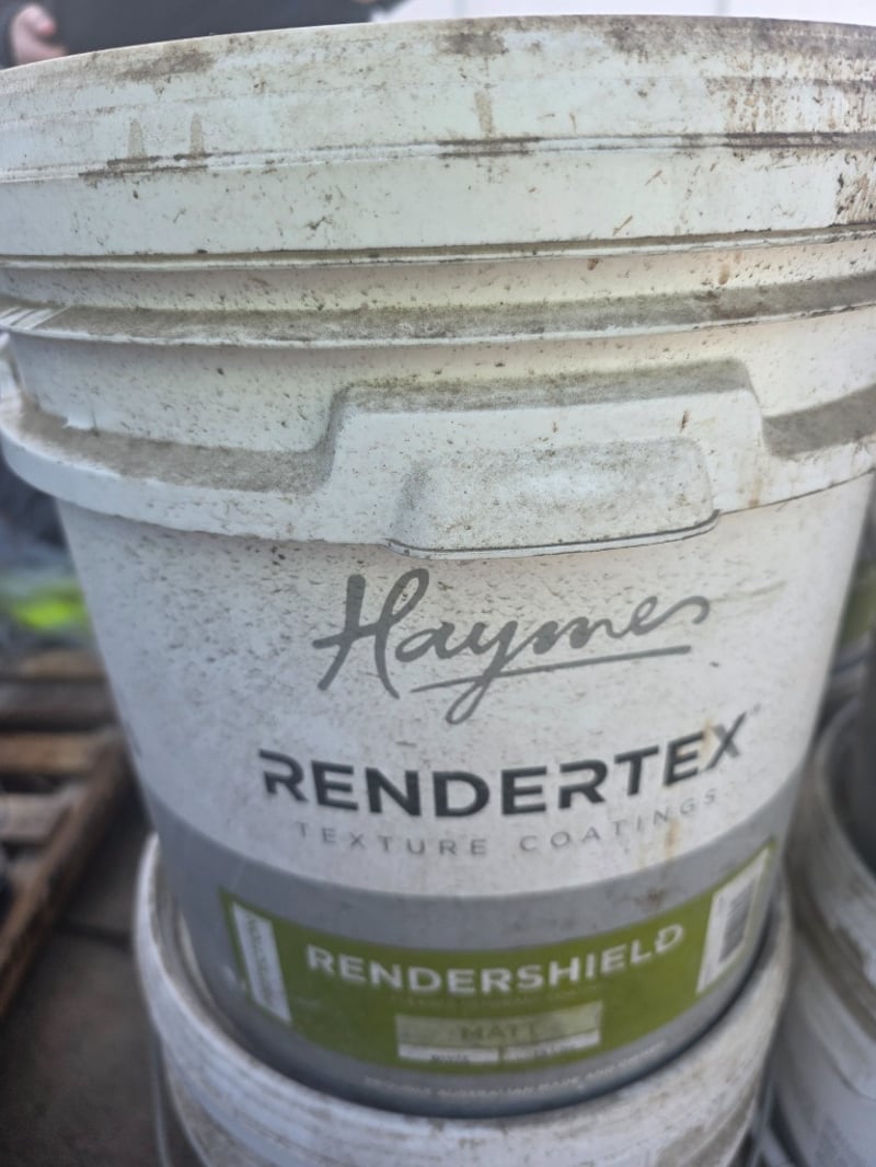 Haymes Rendertex Rendershield Matt White, 15 litre tin Bid per Litre, Must take 15 Litres
