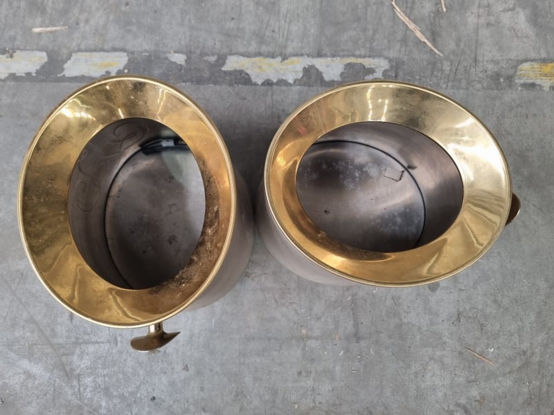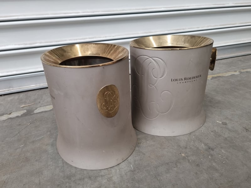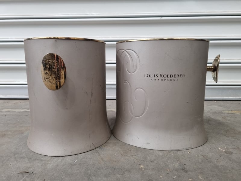 Wine buckets, "Loius Roederer Champagne", gold colour, metal type, quantity: 2, Sold as lot The proceeds from this item sale go to the Little Red Heart Charity to help fund mental health support for children in need. Get ready to bid with heart and make a difference!