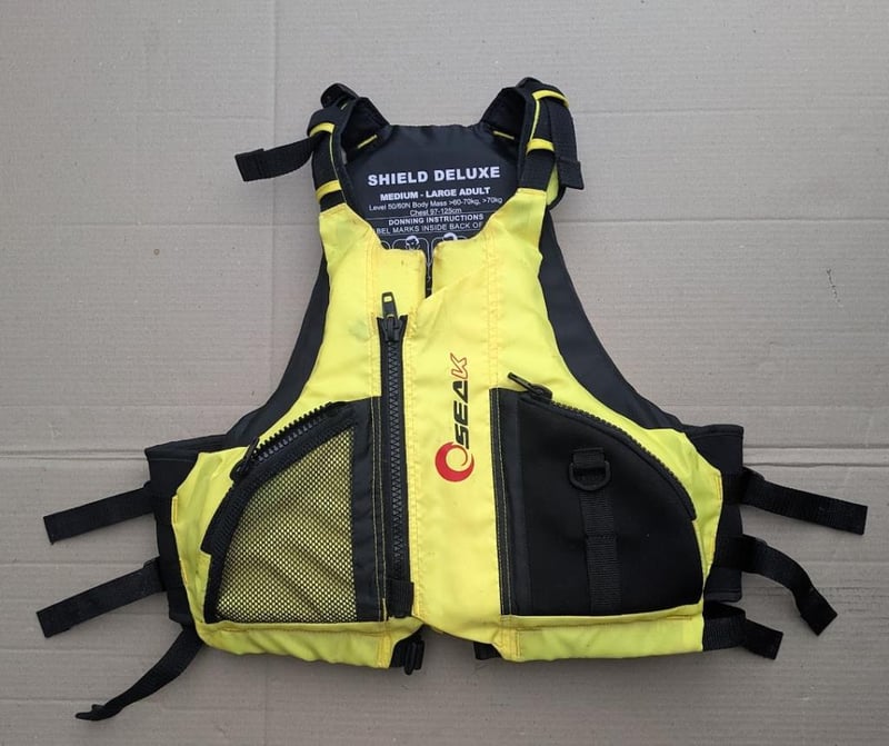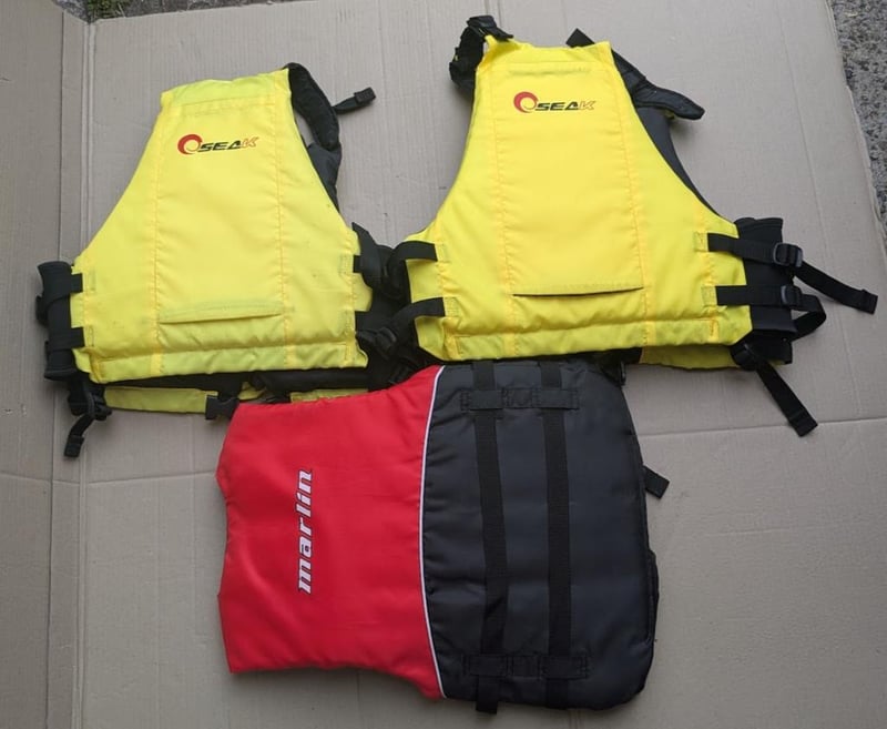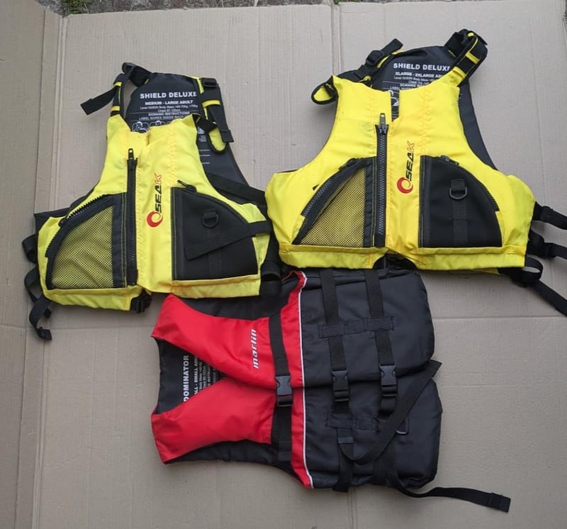 Life Jackets, SEAK shield deluxe adult and 2X adult, and Marlin Dominator small adult qty 3
