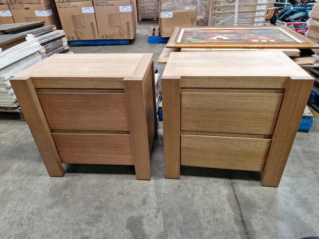 Bedside TablesDescription: light stained timber bedside tables, 2 x drawers.Note: Marks to tops650mmW x 450mmD x 655mmHSOLD AS LOT