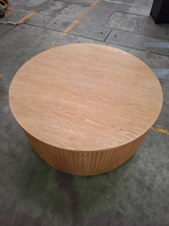 Round timber coffee table, natural finish Dimensions: 43 cm H x 100 cm Diameter NOTE: SCUFFS