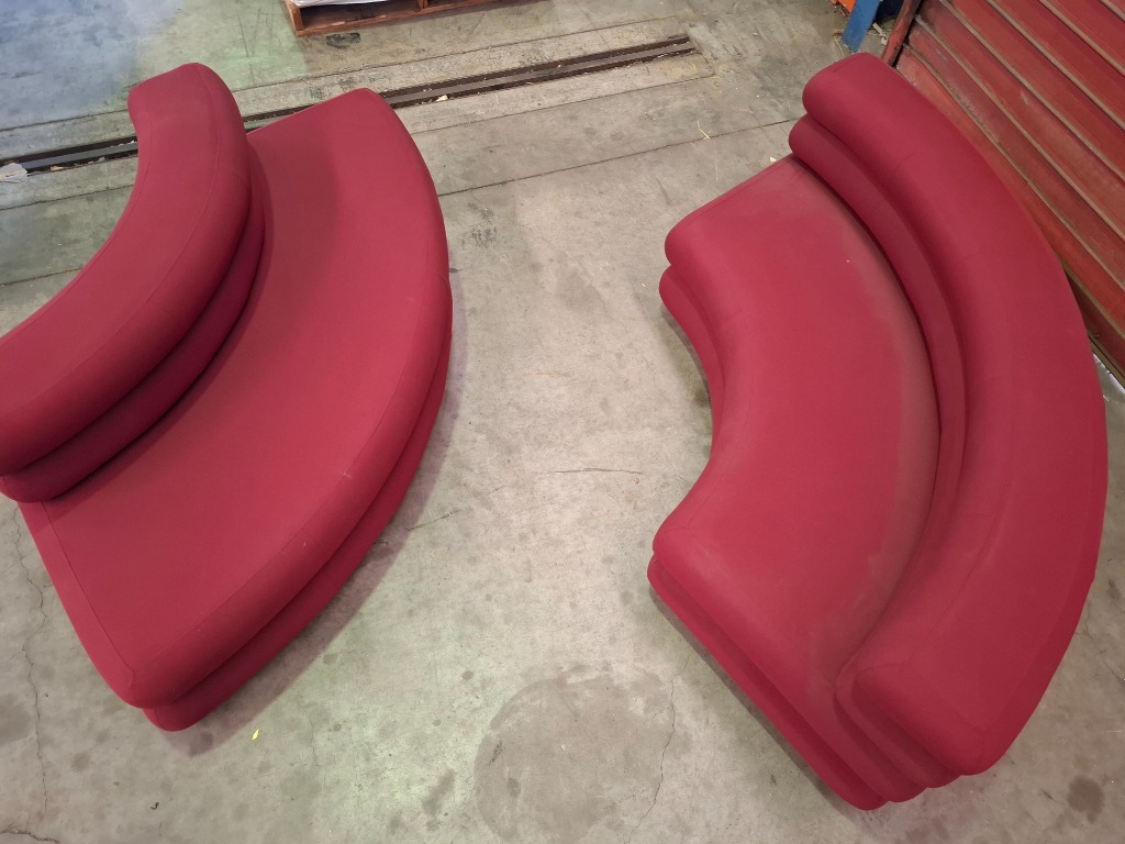Set of two semi circular lounges, fabric red wine colour Dimensions: 74 cm H x 204 cm W x 80 cm D NOTE: CLEANING REQUIRED, INSPECTION RECOMMENDED