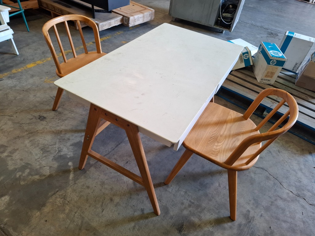 Study Desk, natural timber frame , white top up with two drawers, includes two timber chairs Dimensions: 75 cm H x 120cm W x 60cm D NOTE: SCUFFS AND MARKS, CLEANING REQUIRED