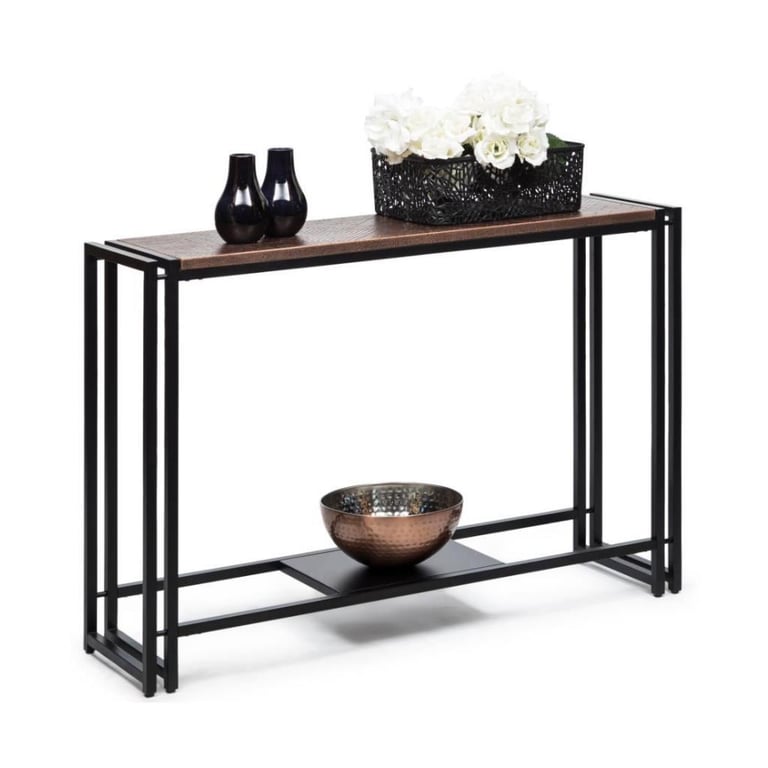 RRP $545 Slim Contemporary Iron Hallway Console Table with Textured Top Brand New - Orignal Packaging - This Sleek Contemporary Hallway Console Table rises to all occasions with utmost elegance. With its sleek architecture, this table is ideal for Entryways, behind sofas and against walls, accommodating all spaces with ease. - Product Dimensions (Length) 114cm (Width) 30.5cm (Height) 77cm - Product Weight 14kg - Colour Frame: Black | Top: Copper Finish -Material(s) Iron
