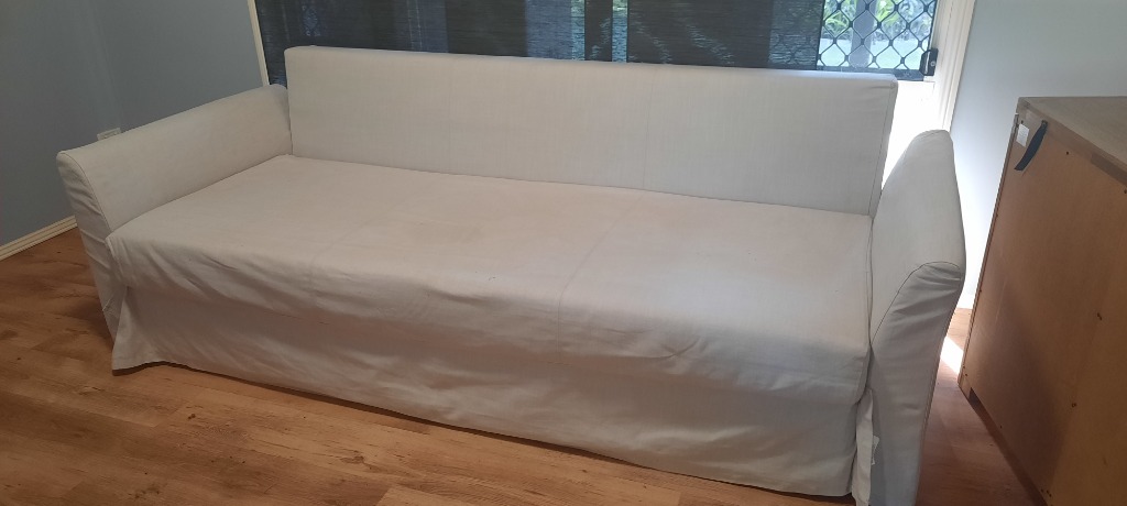 2 seater couch/ futon, size unknown, fabric upholstery