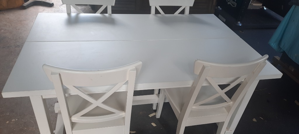 Dining table with chairs, table size 76cmH x 96cmW x 156cmL, chair size 91cmH x 42cmW x 43cmL, extendable NOTE: SCUFFS AND MARKS