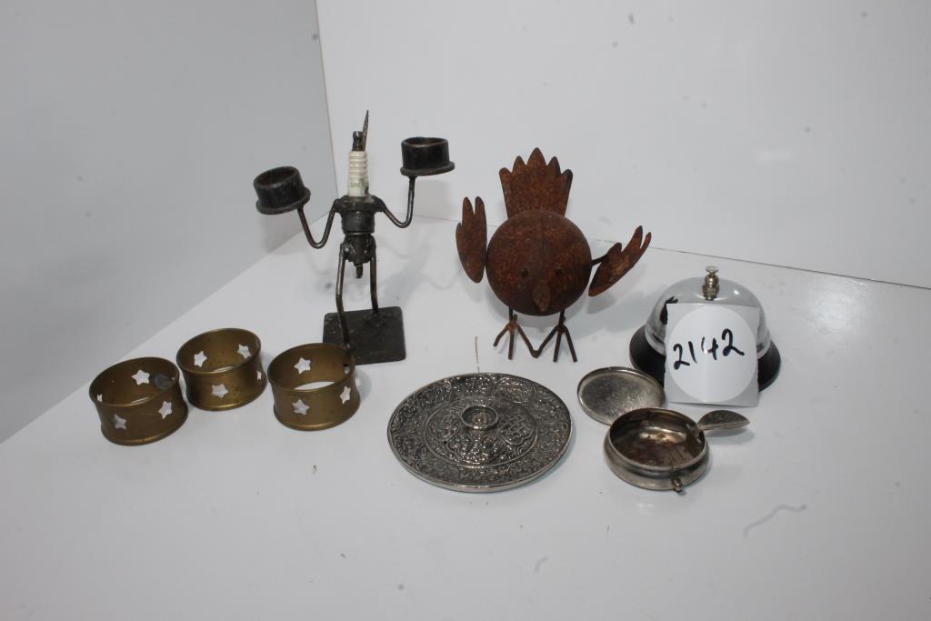 Metal Decor & Curios Lot – Candlestick Man, Bird, Bell, Trinkets (8pcs) Includes spark plug candlestick figure, rusted bird sculpture, service bell, 3 brass napkin rings, ornate metal plate, and engraved trinket tin (rusted inside). All items show age, wear, or patina – rustic and industrial character throughout.