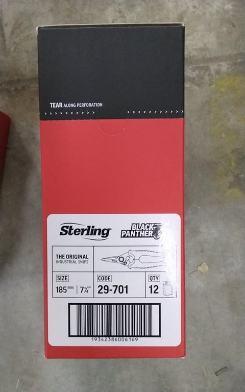 Industrial Snips Make, Sterling Black Panther Description, industrial snips, size 185mm (7 1/4") code 29_701 12 pairs snips to carton BID PER EACH CARTON