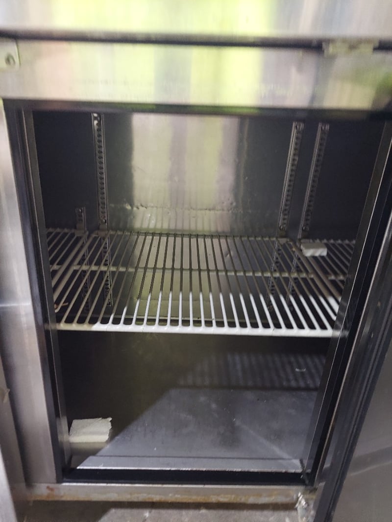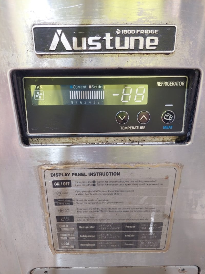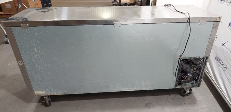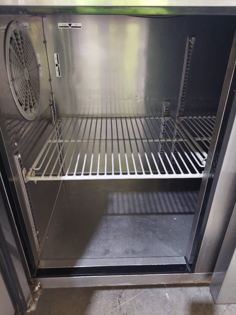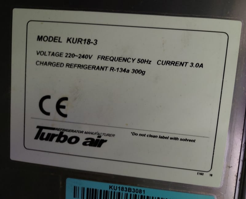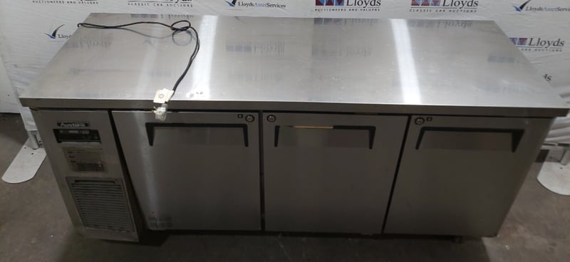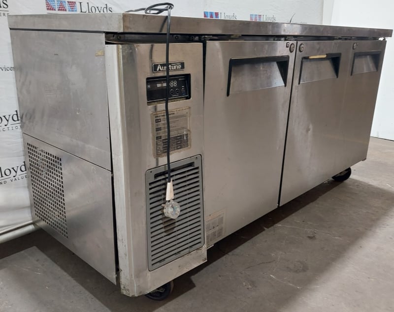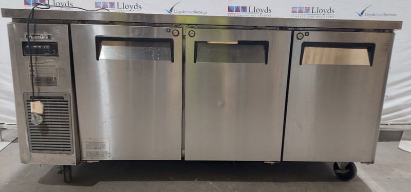 Austune 3-door underbench fridge (Model KUR18-3, 220-240V, 50Hz, R-134a refrigerant, 3.0A current), Turbo Air underbench refrigerator with wire shelving, and additional stainless steel 3 door underbench storage units. Units feature solid doors, wire or solid shelving, and rear-mounted cooling systems with exposed condenser coils and fan assemblies.Note : untested,signs of wear