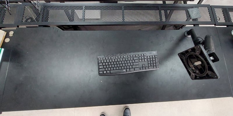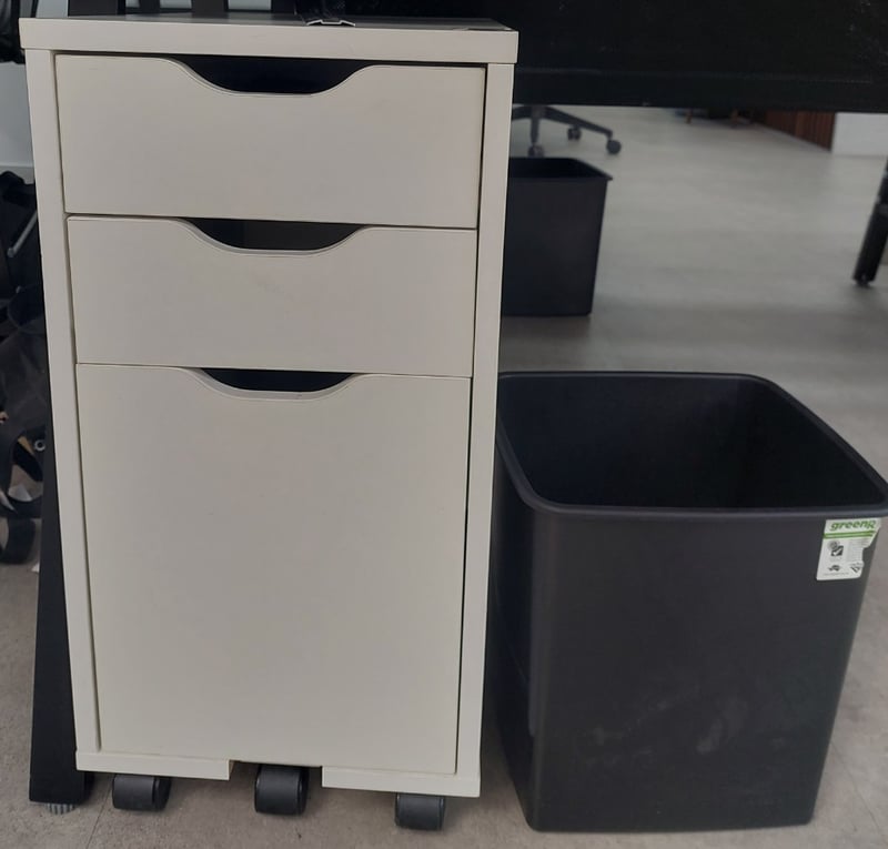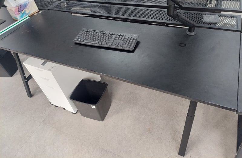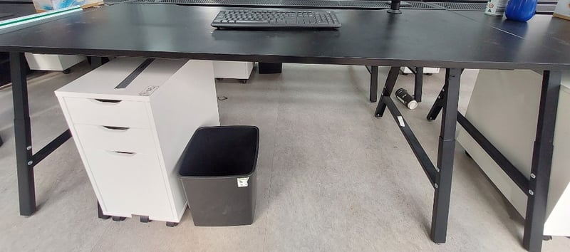 Office lot including, Ikea Utespelare gaming desk, 3-drawer mobile pedestal, plastic bin Table dimensions: 160cm L, 80cm W, 76cm H Sold as a lot. Note: items are untested, signs of wear.