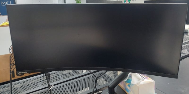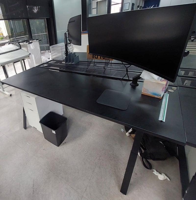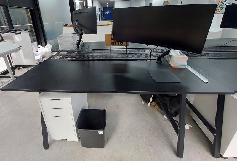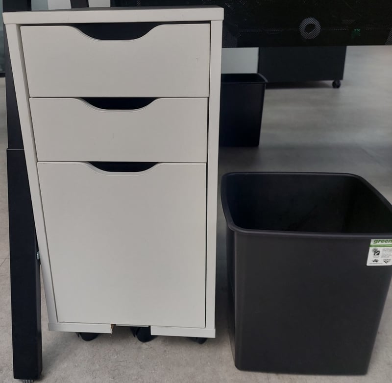 Office lot including, Ikea Utespelare gaming desk, 3-drawer mobile pedestal, plastic bin a Lenovo 34 inch G34w-10 ultrawide curved gaming display with mounting stand and more... Table dimensions: 160cm L, 80cm W, 76cm H Sold as a lot. Note: items are untested, signs of wear.