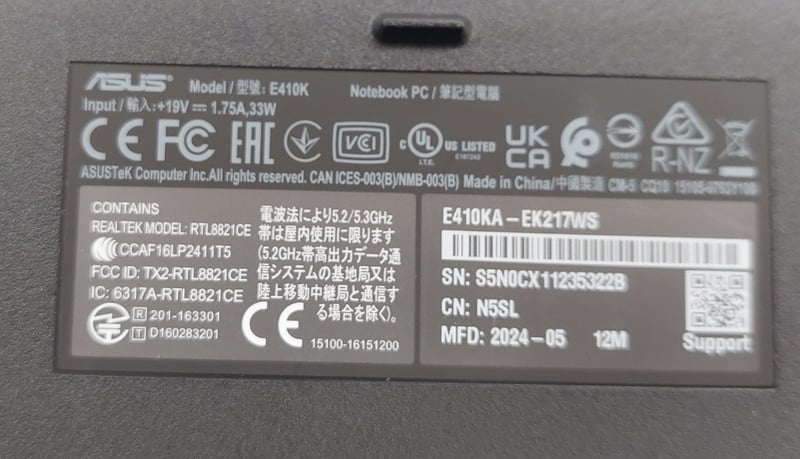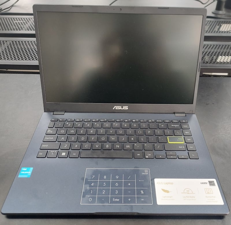 Laptop PC - Asus E410K model EK217WS, 14" screen, Celeron processor, DOM: 2024, S/N: S5N0CX11235322B Note: item is untested, signs of wear.