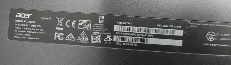 Laptop PC - Acer Aspire 5, model N20C5, 15.6" screen, Core i7 11th Gen. processor, DOM: 2022, S/N: NXA19SA00G2091146C3400 Note: item is untested, signs of wear.