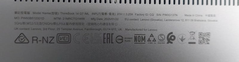 Laptop PC Lenovo ThinkBook 14 G7 IML, 14" WUXGA screen, Core Ultra 5 12-core processor, DOM: 2025, S/N: PW0G137N Note: item is untested, signs of wear, may be missing parts.