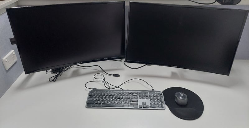 Office lot including, x2 Samsung CF390 Series 27-inch Curved Monitor Model: LC27F390FHEXXY, Logitech mouse and keyboard.Sold as a lot.Note: items are untested, signs of wear.