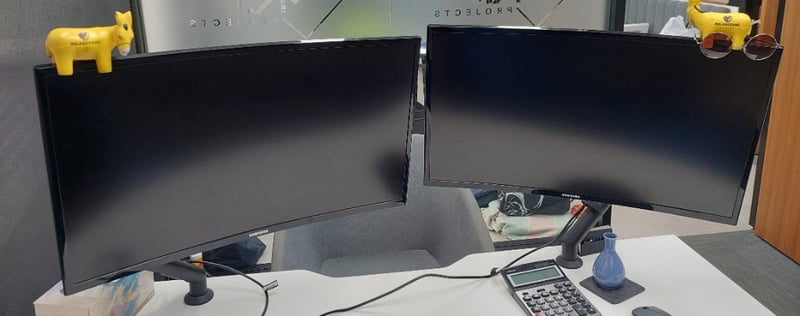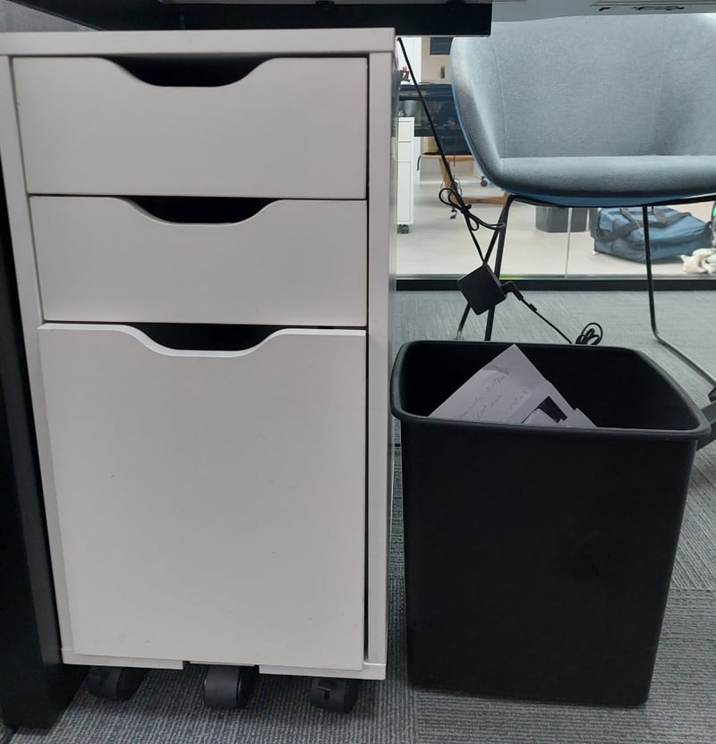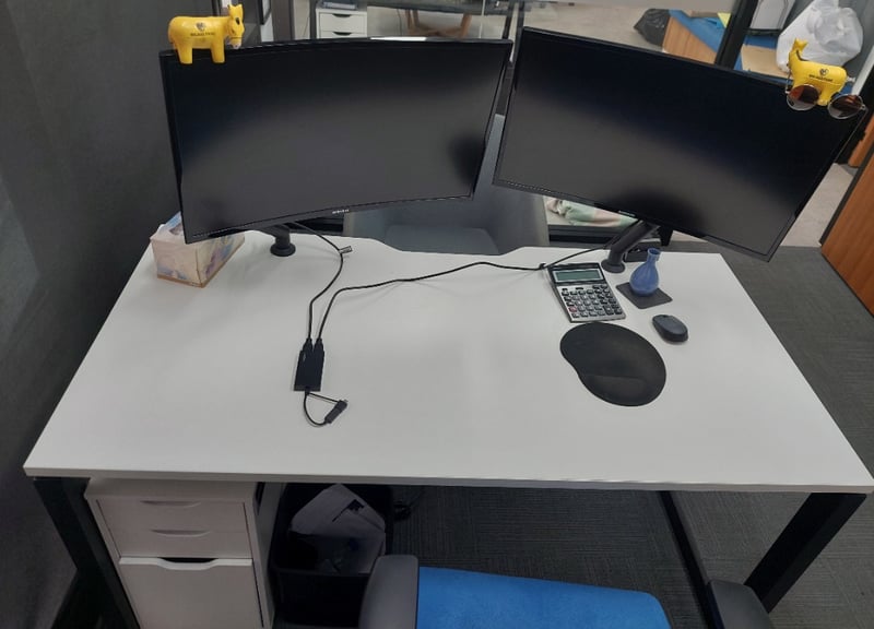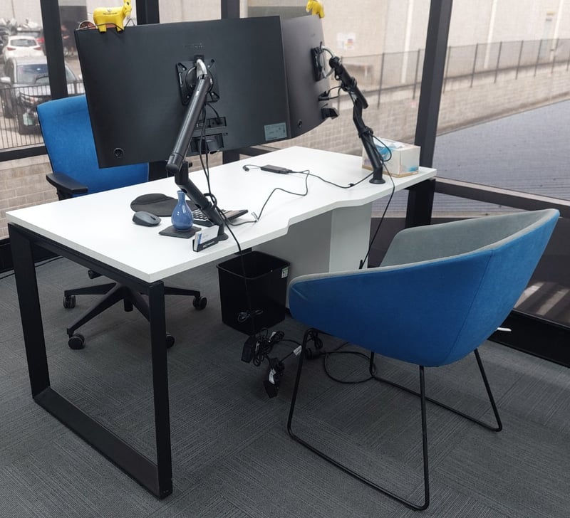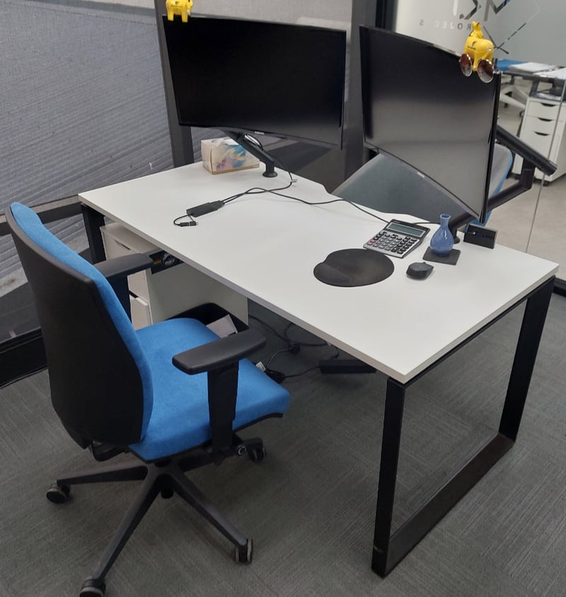 Office lot including, table, chairs, filing cabinet, x2 Samsung C27F390 27-inch curved Full HD (1080p) LED monitor with mounting arms and more... Sold as a lot. Note: items are untested, signs of wear.