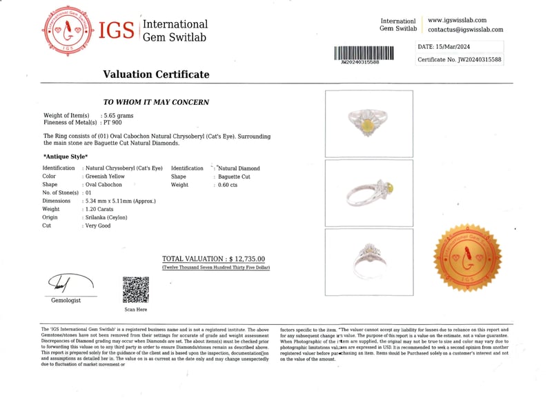 PLATINUM NATURAL DIAMOND AND CHRYSOBERYL RING Date : 18-03-2024Category : Ring Comment : Pt 900Natural Chrysoberyl : 1.20 Carat Natural Diamond : 0.60 Carat Item Weight : 5.65 G*Antique Style* Condition: New - Refer Images160033+5