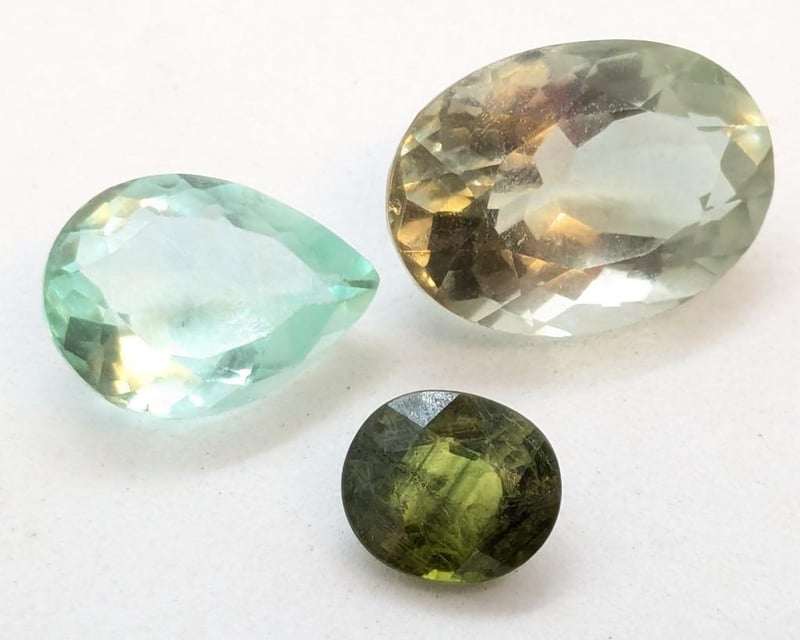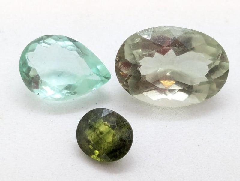 TWO GREEN AQUAMARINE GEMSTONES (PEAR CUT, 4.9CT AND OVAL CUT, 8.7CT) AND ONE OVAL CUT GREEN CHRYSOBERYL GEMSTONE