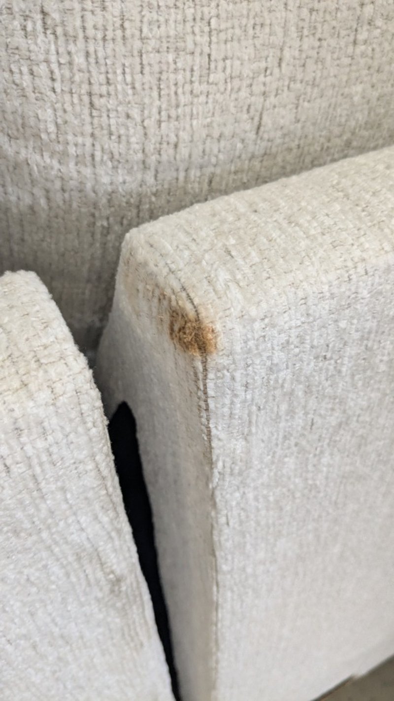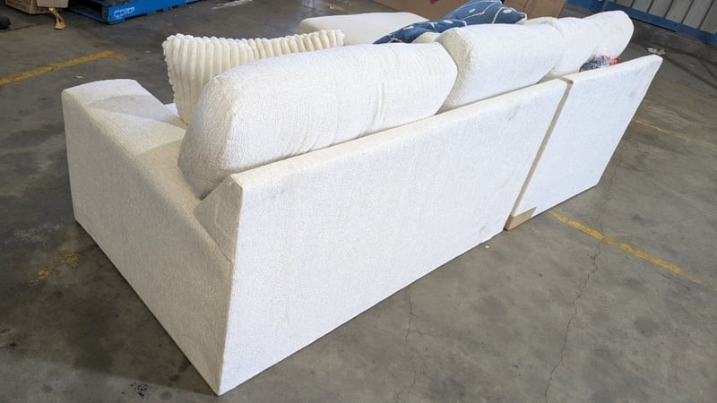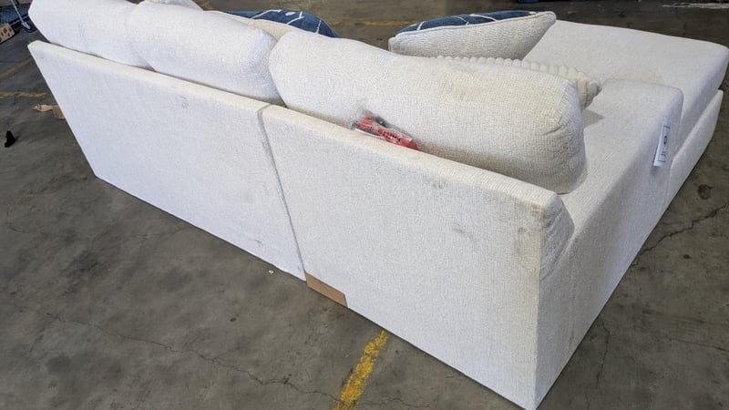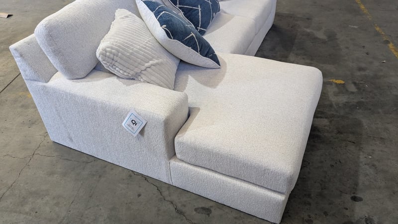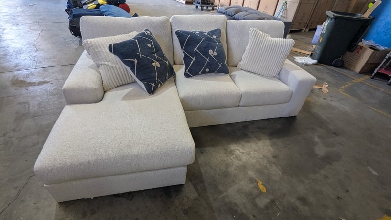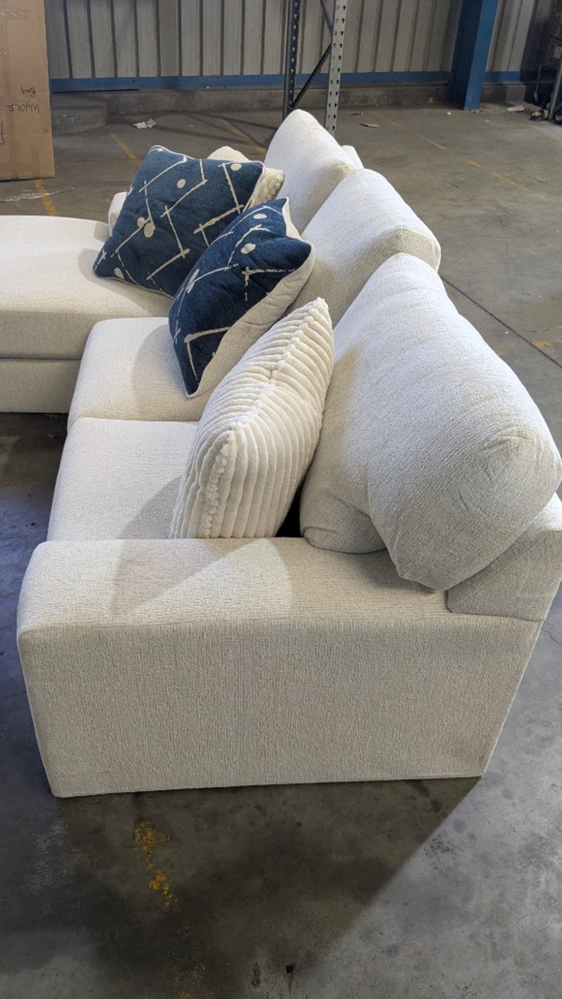 RRP $2499, Stardust 3-Seater Fabric Sofa with Chaise Product Type - Chaise Lounges Colour - Snow Number of Seats - 3 Frame Material - Laminated Veneer Lumbar, Oriented Strand Board Leg Material - Plastic Upholstery - Fabric Support System - Nylon Decking Back Cushion Filling Material - Fibre Seat Cushion Filling Material - Fibre, High Resiliency Foam Assembly Type - Assembly Required Width - 249cm Height - 96cm Depth - 165cm NOTE: MARKS VISIBLE