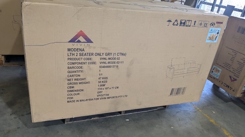 RRP $1499, Modena 2-Seater Leather Sofa - Grey, Model: VHNL-MODE-02 Product Type - Sofas Colour - Grey Number of Seats - 2 Frame Material - MDF, Plywood Leg Material - Rubberwood Upholstery - Leather Support System - Webbing, Sinuous Springs Back Cushion Filling Material - Foam Seat Cushion Filling Material - High Density Foam Product Height (cm) - 97 Product Width (cm) - 174 Product Depth (cm) - 107 Weight (kg) - 52