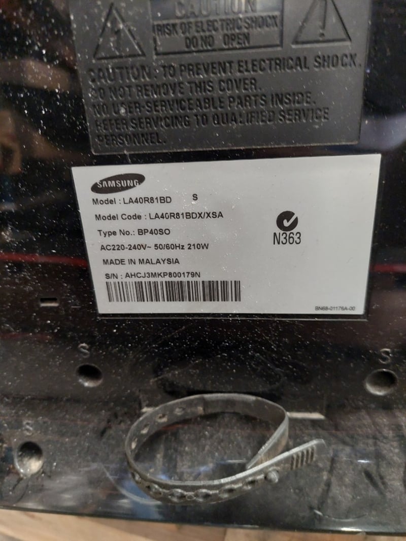 Samsung 40inch television, includes wall bracket Dims: 99cm x 60cm x 5cm Model: LA40R81BDX/XSA Serial number: AHCJ3MKP800179N Note: item is untested.