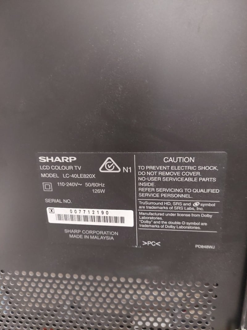 Sharp LCD 40inch television, includes wall bracket Dims: 99cm x 66cm x 4cm Model: LC-40LE820X Serial number: 007712190 Note: item is untested.