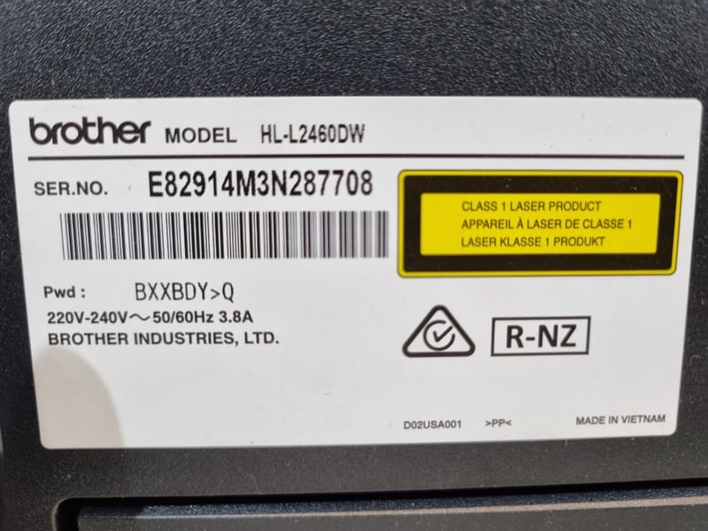 Brother Mono Laser PrinterModel: HL-L2460DWSerial: E82914M3N287708Dimensions:36x37x30cm