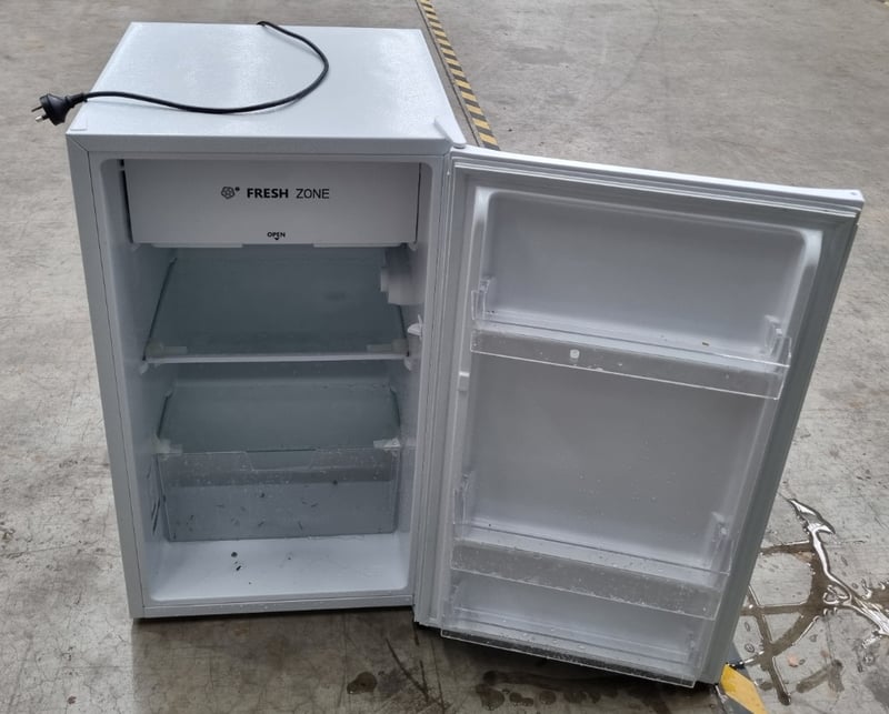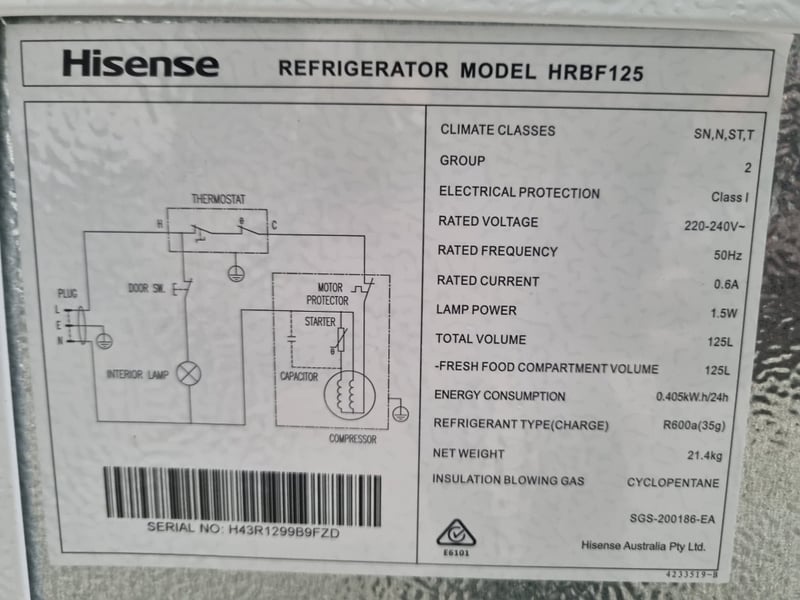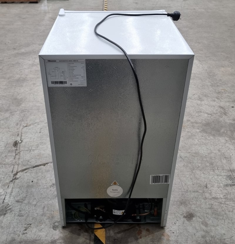 Hisense Mini Refrigerator, 2 Shelves, Vege Draw, Chill Zone at top Model: HRBF125 Serial: H43R1299B9FZD Dimensions: 53 x 48 x 84cm