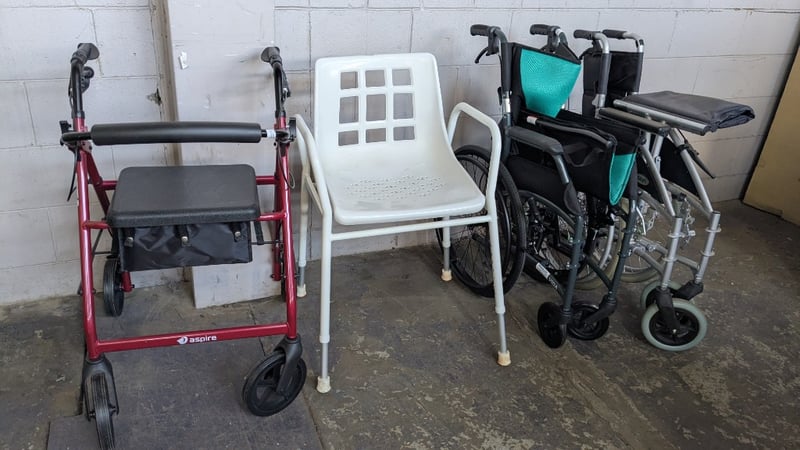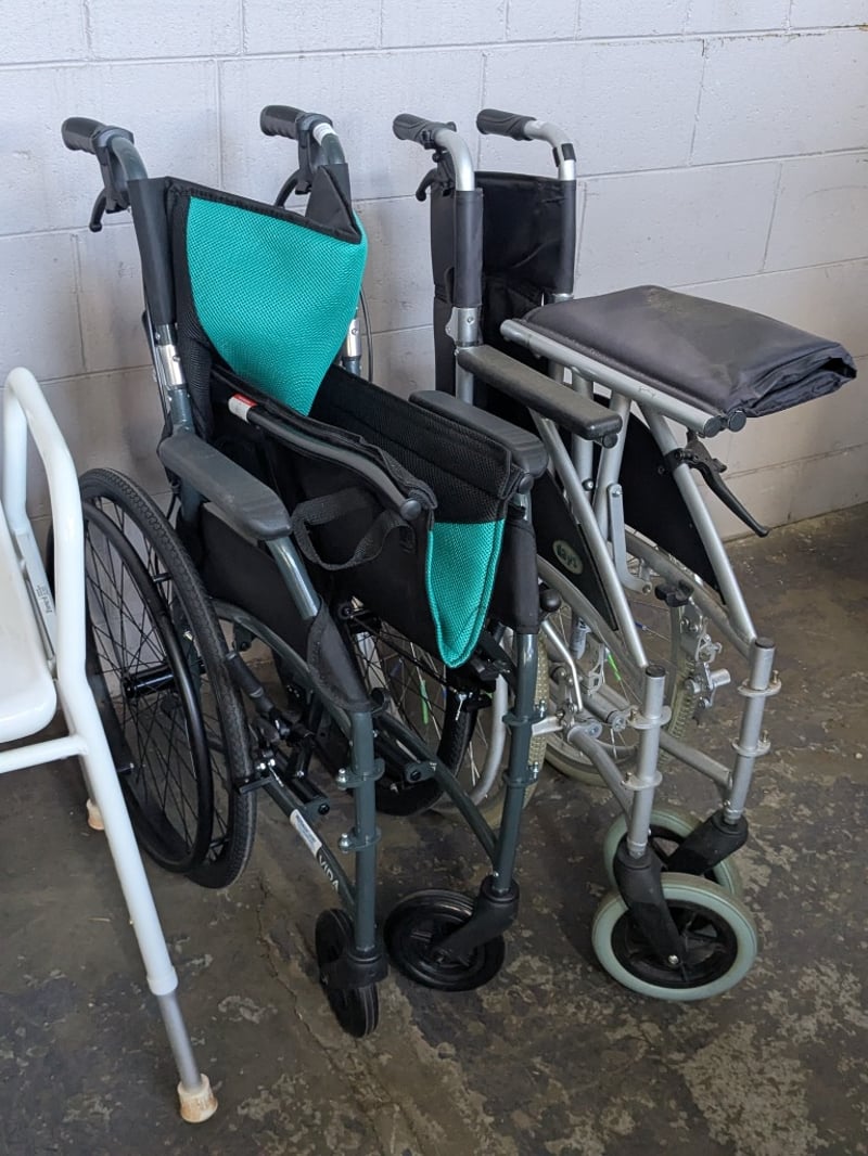 Mobility equipment, includes 2 x wheelchairs, shower chair and walker Sold as lot