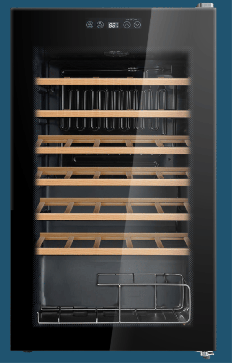 RRP $599, Harbour Cellar Wine Cooler, 470mm, 34 Bottle Capacity, Timber Shelves, Black Glass Model: HBRWC34B