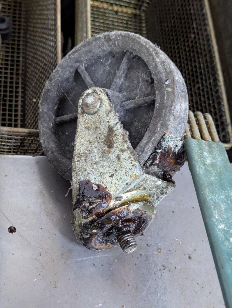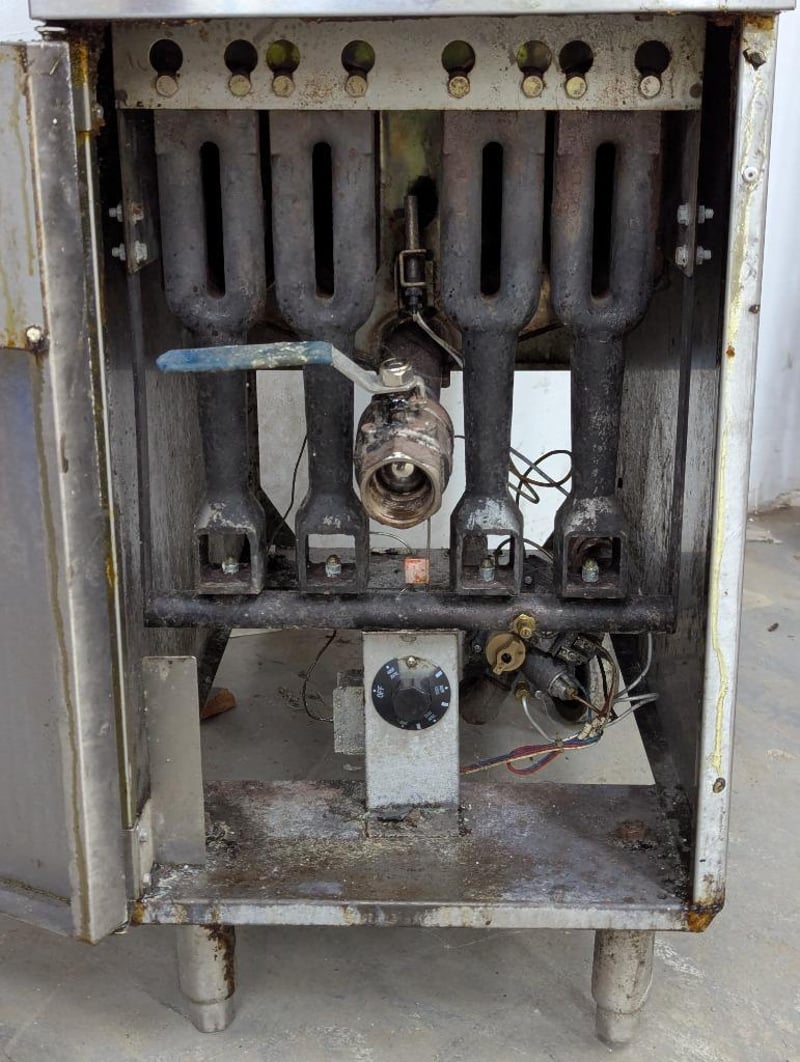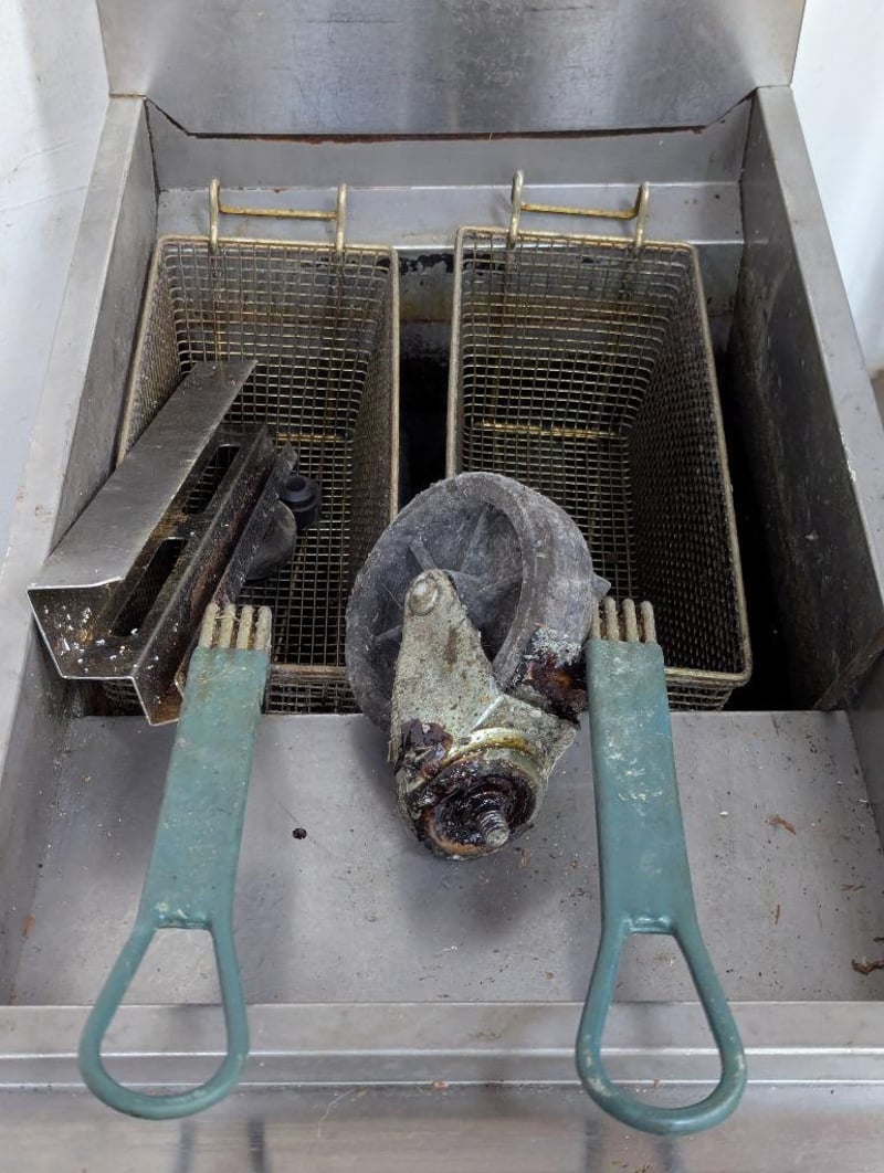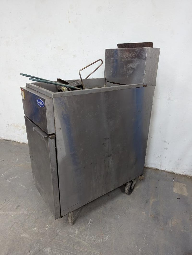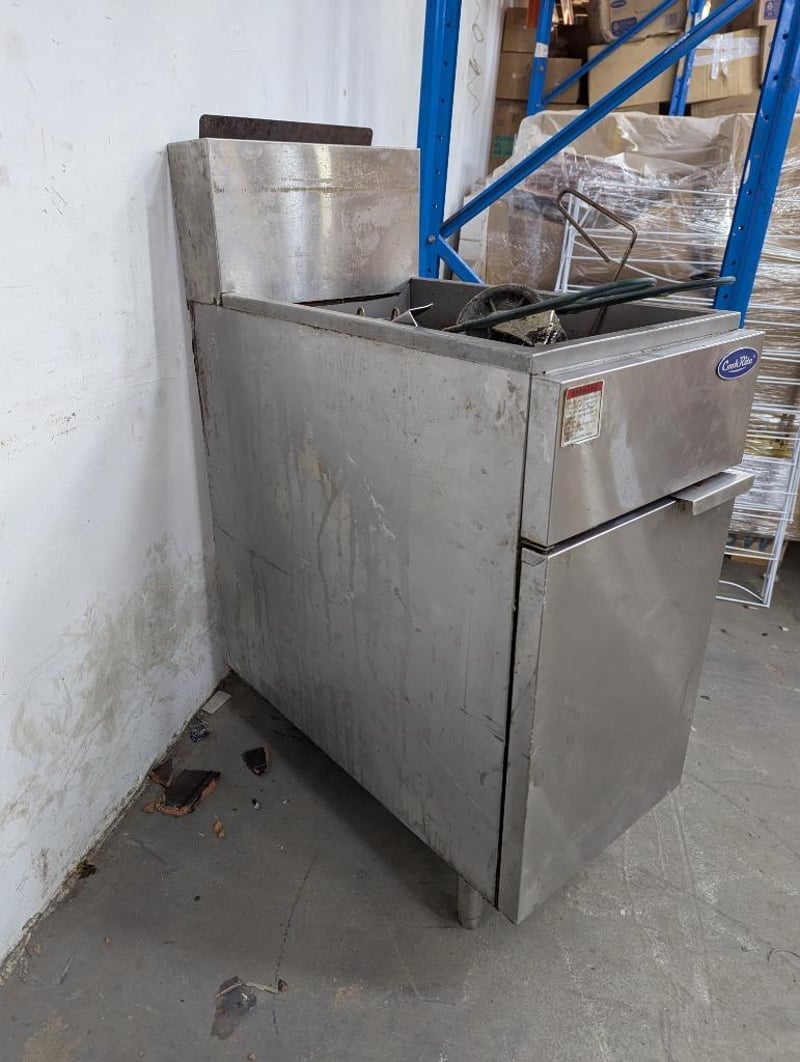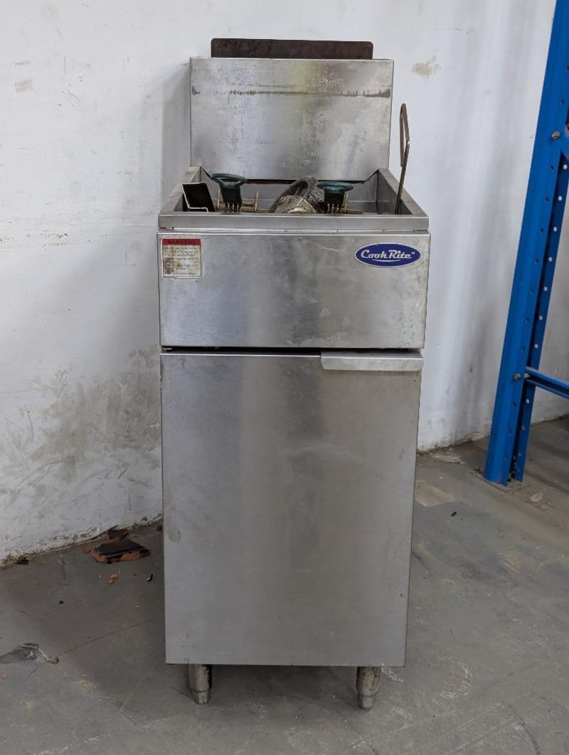 Derp fryer, Cookrite, 2 basket station Note: rear left wheel requires reattachment Dimensions: H 112cm x W 39.5cm x D 79cm