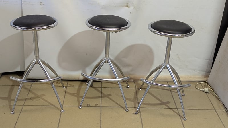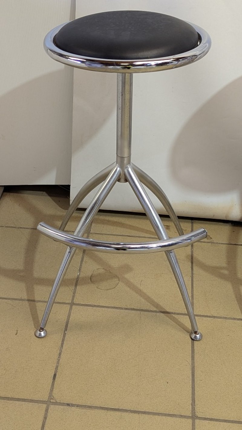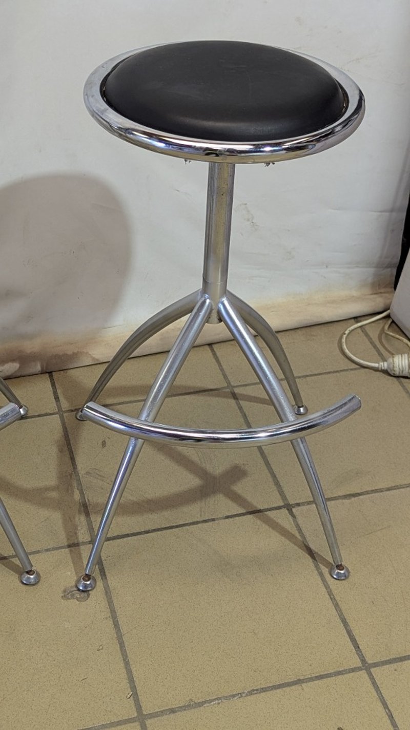 Bar stools, round black finish leather style seating, metal frame Dimensions: H 68cm x W 35cm x D 40cm SOLD AS LOT