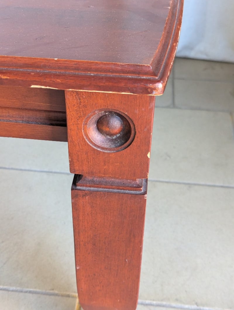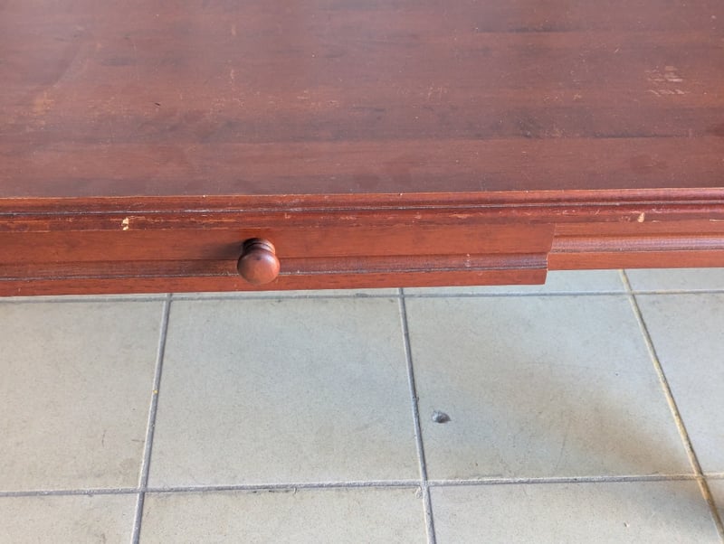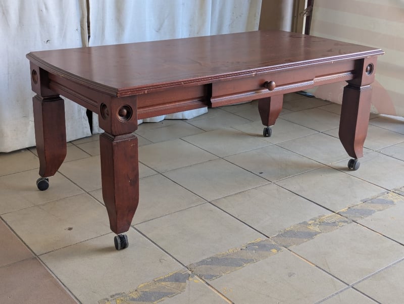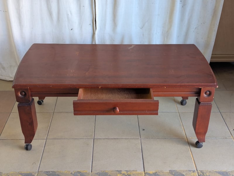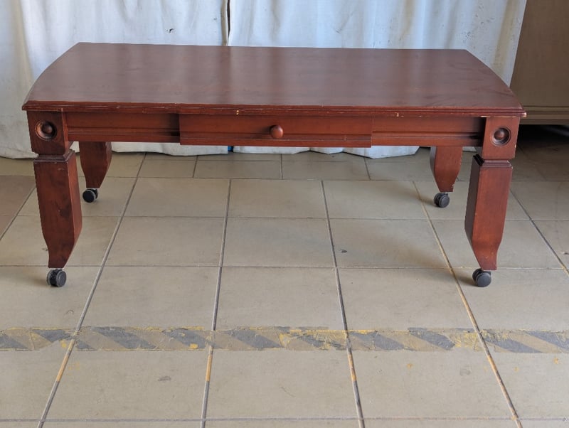 Coffee table, timber, decorative trim, one drawer, on wheels Note: general wear and tear Dimensions: H 50cm x W 120cm x D 60.5cm